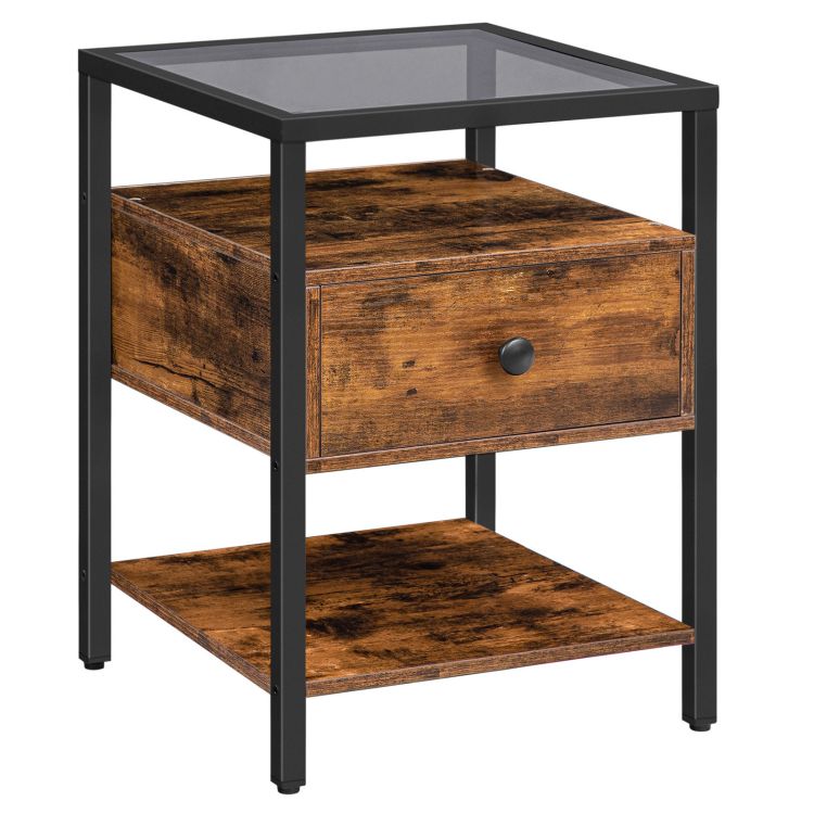stolik nocny, szklany stół boczny z szufladą i półką, stół nocny do salonu, sypialnia, przedpokój, stabilne szkło temperamowane, łatwe do czyszczenia i złożenia, rustykalny brąz i czarny