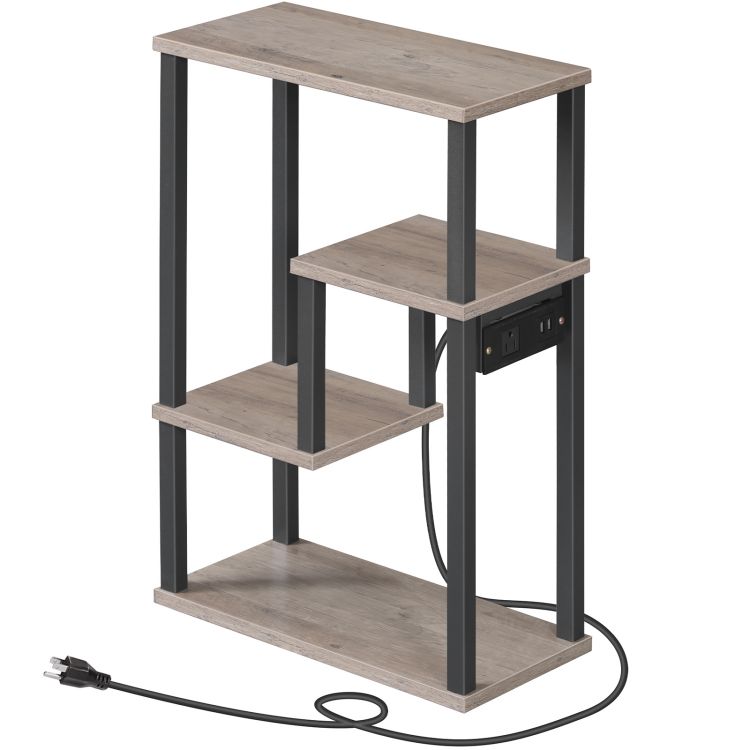 Wąski stolik końcowy ze stacją ładującą, Stolik boczny z półką drabinkową do małych przestrzeni, Szafka nocna z gniazdkiem i portami USB, Stolik nocny do salonu, Szaro-czarny