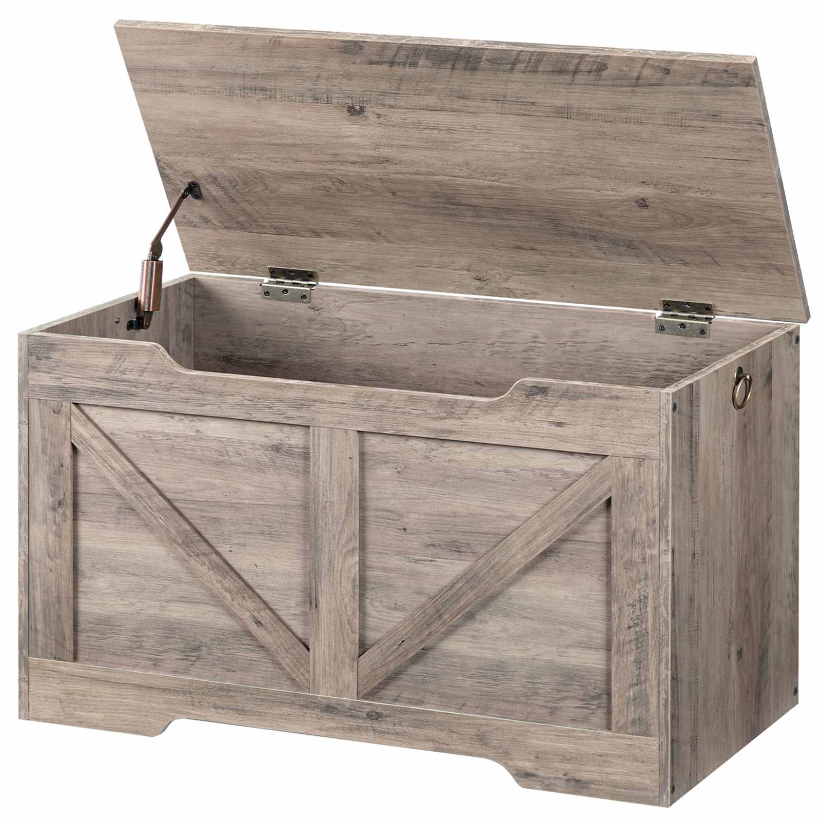 Szara drewniana skrzynia do przechowywania, Organizer na zabawki w stylu retro z wyciętym uchwytem w kształcie litery U, Wielofunkcyjna ławka do przechowywania, Zawias bezpieczeństwa, Solidna struktura, 100kg Nośność, Łatwy montaż