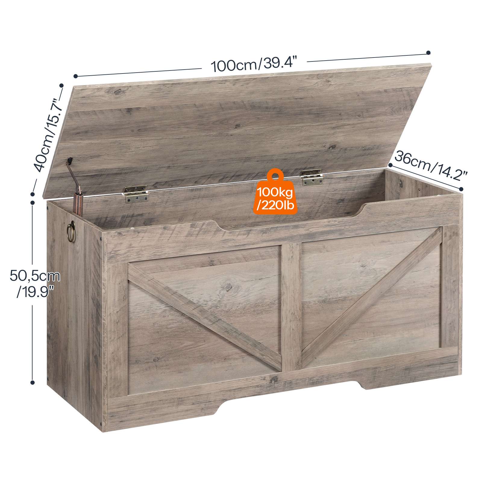 Przestronna pojemność: Ławka ze schowkiem ma wymiary całkowite 100 cm (L) × 40cm (W) × 50cm (H). Pod uchylną pokrywą znajduje się duża przestrzeń do przechowywania, oferując różnorodne możliwości przechowywania. Można w nim przechowywać różne zabawki, książki, torby i inne przedmioty, realizację inteligentnej maksymalizacji przestrzeni.