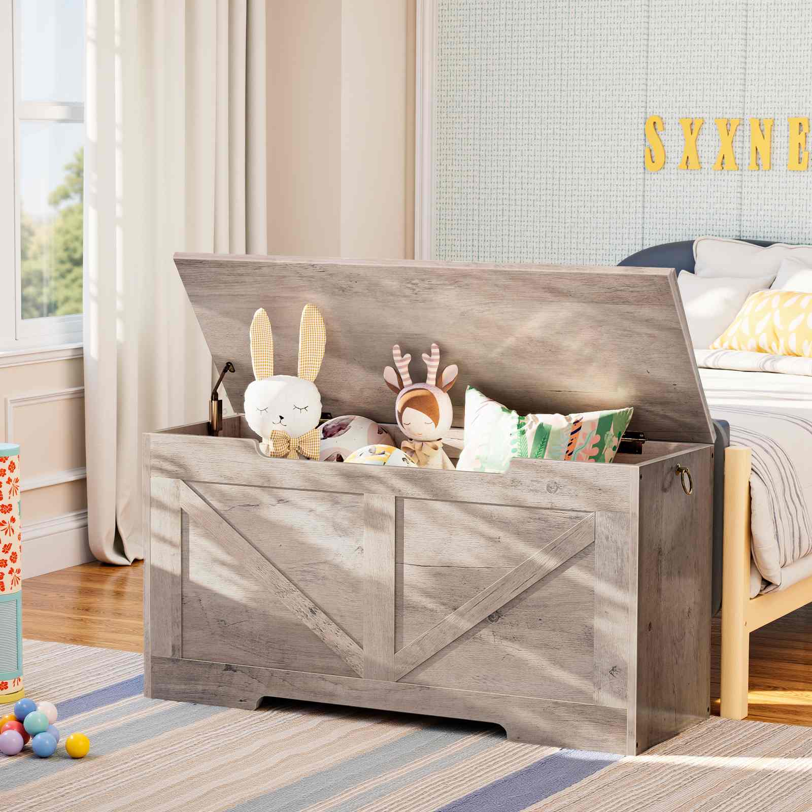 Solidna i bezpieczna konstrukcja: Bagażnik wyposażony jest w zawiasy zabezpieczające oraz wpusty przednie, ułatwiają płynne otwieranie i zapobiegają szybkiemu zamknięciu organizera zabawek, zapewniając bezpieczną pracę. Wycięty uchwyt w kształcie litery U umożliwia wygodne przenoszenie i przenoszenie.