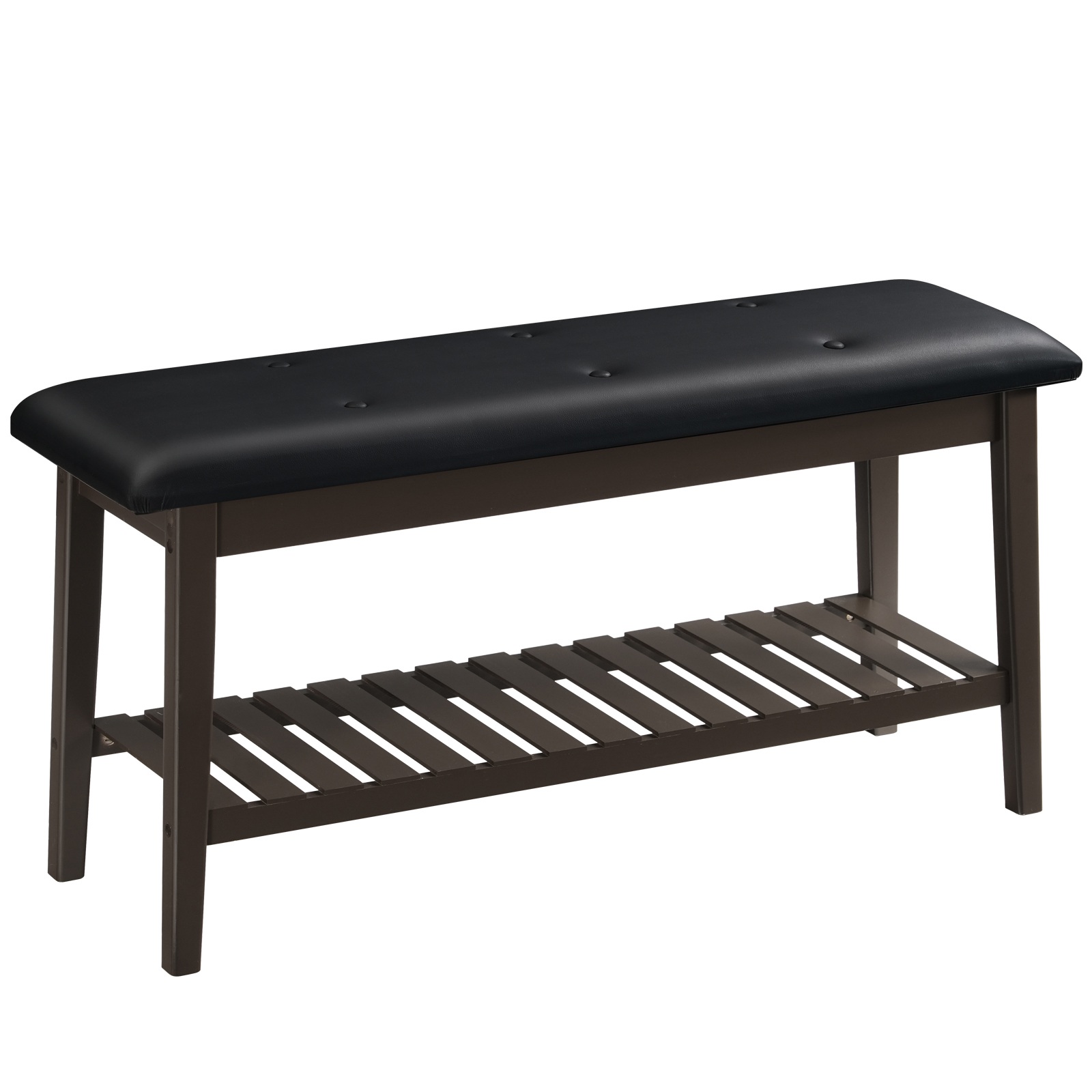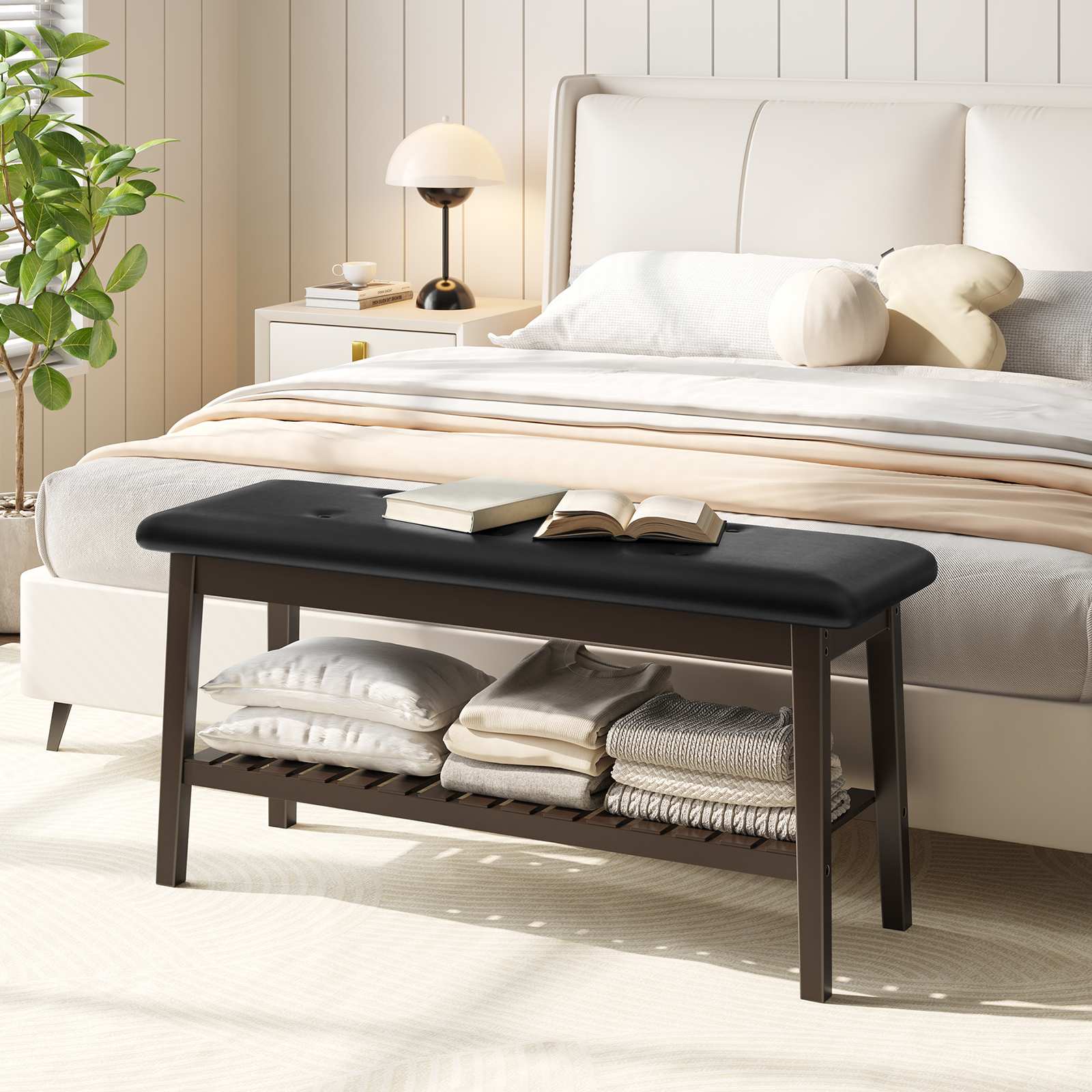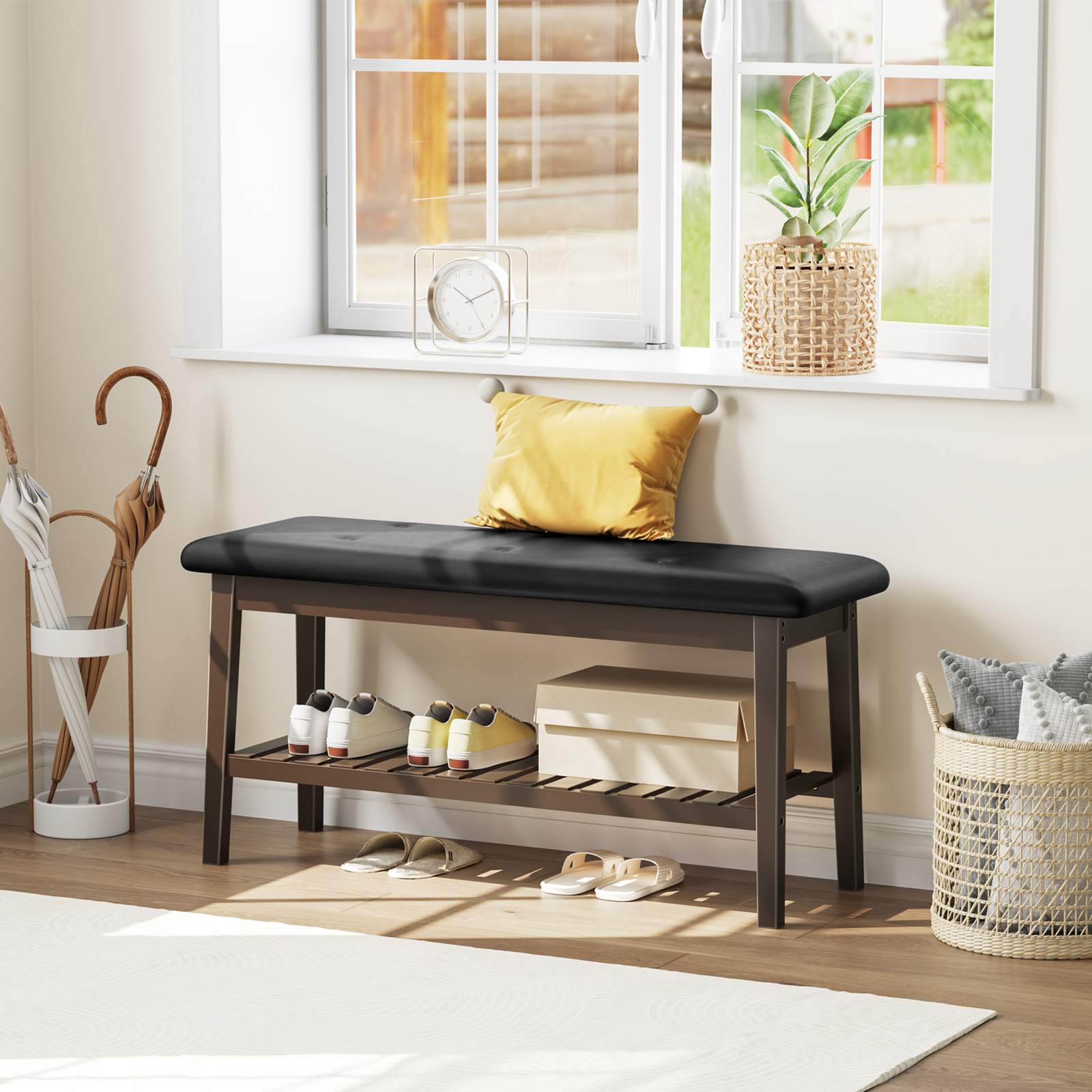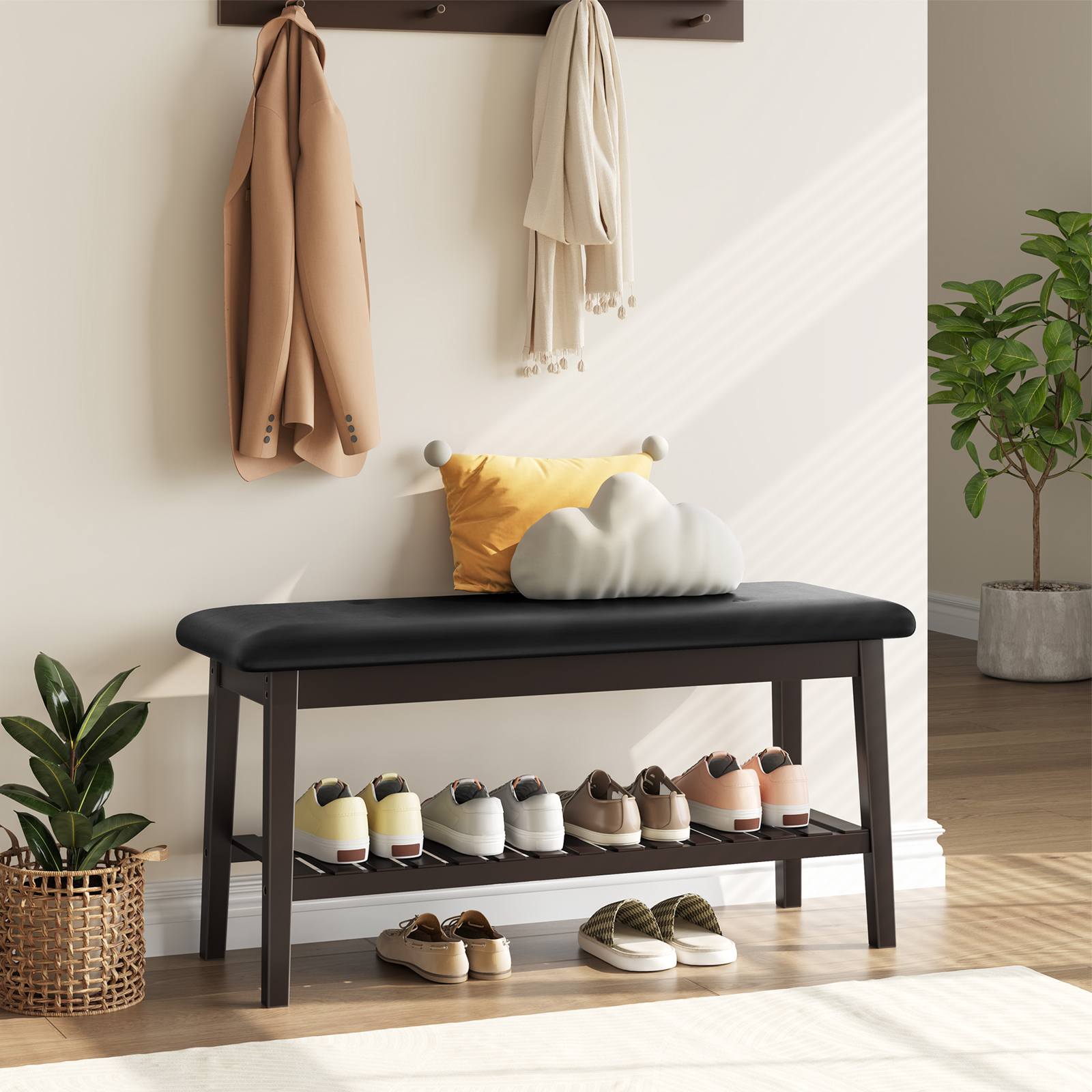 Combining contemporary style with everyday comfort, this shoe bench features an ergonomic curve and upholstery seat. Its soft texture and modern design help create a welcoming atmosphere in your home. Finished in rich brown and classic black, this versatile organizer works as a bed-end bench, dining seat, or entryway storage. The natural bamboo grain adds refined elegance, while the two-tier design offers ample space to organize essentials and maintain a neat, clutter-free living space.