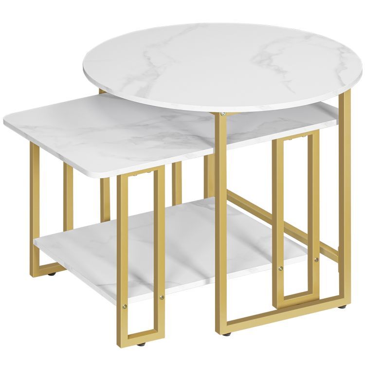 Mały zestaw do stolika do kawy, Stoliki kawowe ze sztucznego marmuru z metalową ramą, Zestaw nowoczesnych stolików kawowych do gniazdowania 2, do salonu, Marmur Biały i Złoto