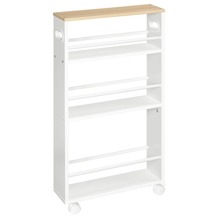 - elegancki i solidny: panele z naturalnego drewna i solidna biała rama nadają tej wąskiej półce kuchennej wygląd pasujący do jej praktyczności. Jest wytrzymały i wystarczająco wytrzymały, aby przechowywać wiele przedmiotów o różnych wysokościach i ciężarach. Każdy poziom tego wózka kuchennego ma paski ochronne po obu stronach, aby zapobiec wypadaniu przedmiotów