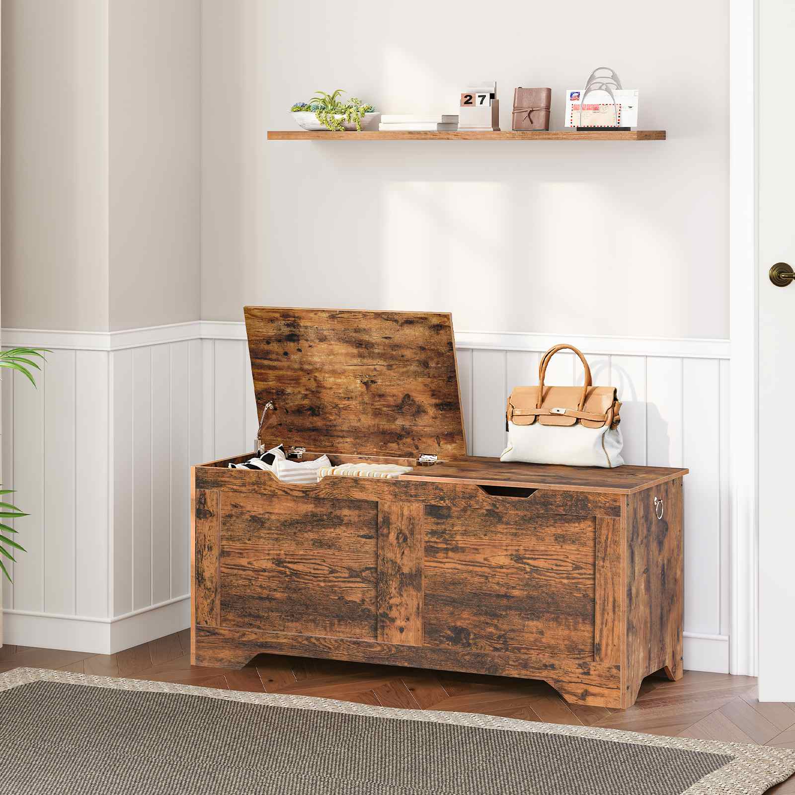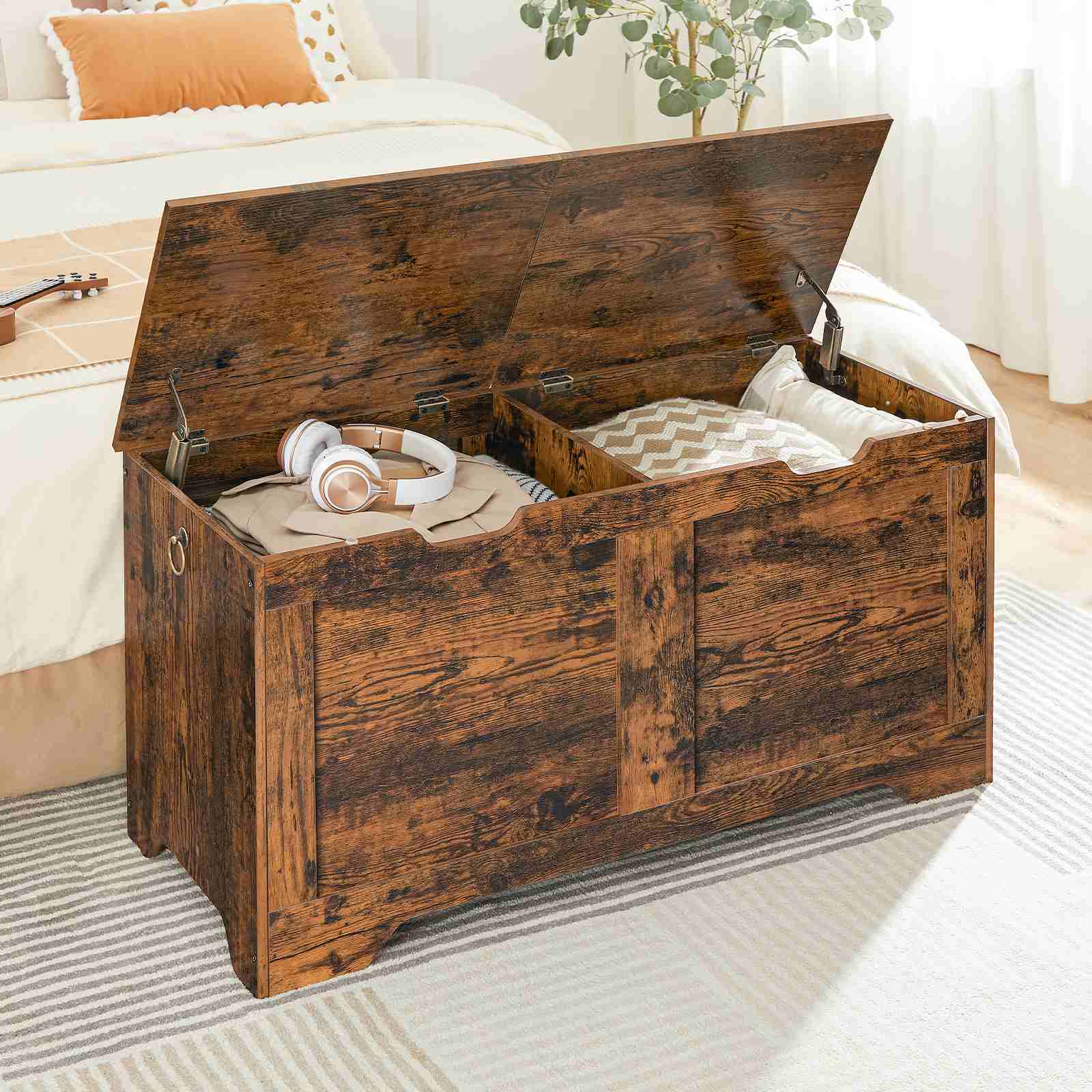 Dual-Lid Storage Chest, 100cm Rustic Brown Storage Bench with Internal Divider, Multifunctional Shoe Bench for Entryway, Living Room and Bedroom