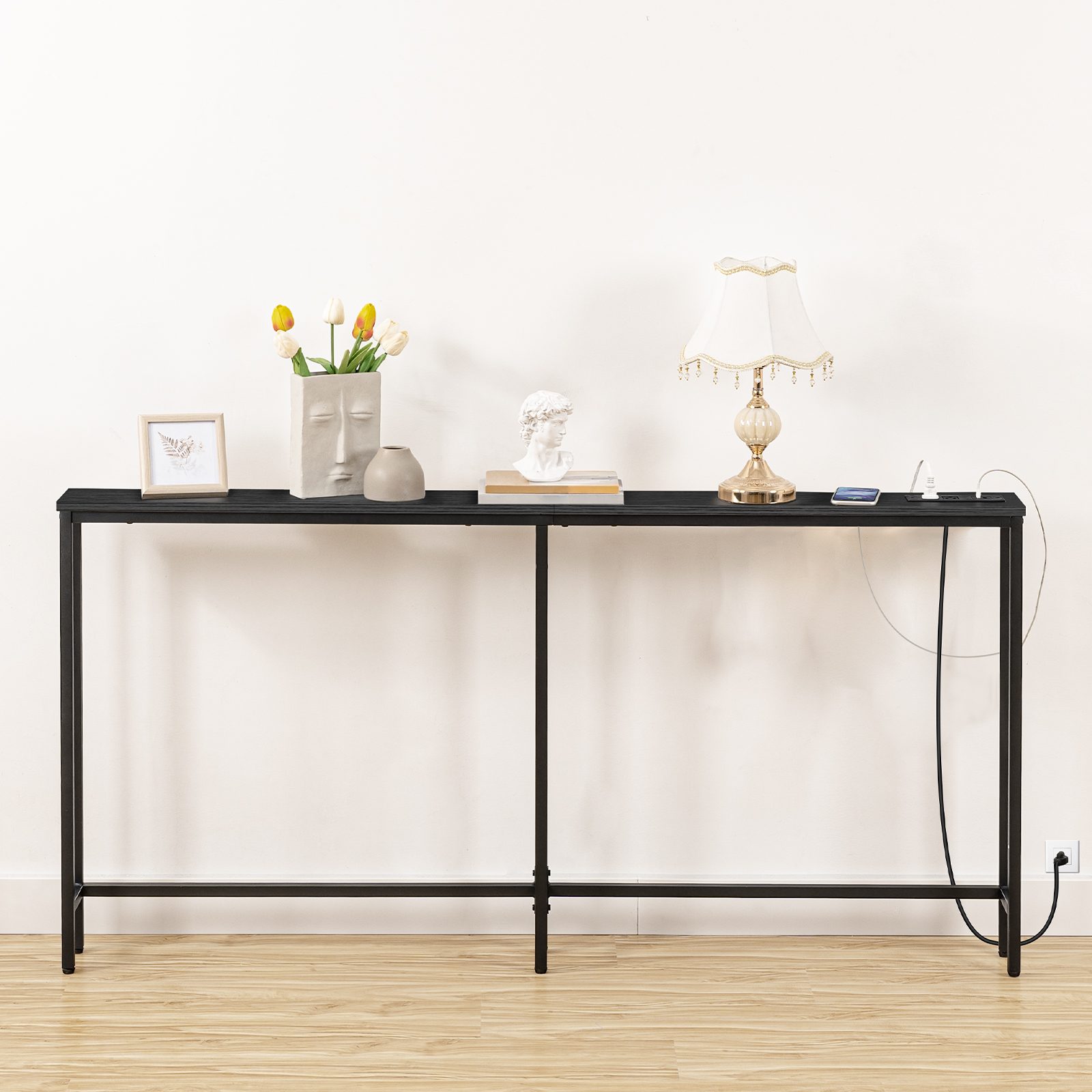 5.9-Inch Narrow Console Table with Integrated Charging Station, 63-Inch Slim Sofa Table Equipped with Power Outlets & USB Ports, Multi-Functional Entryway Table for Residential & Commercial Spaces, Black Finish