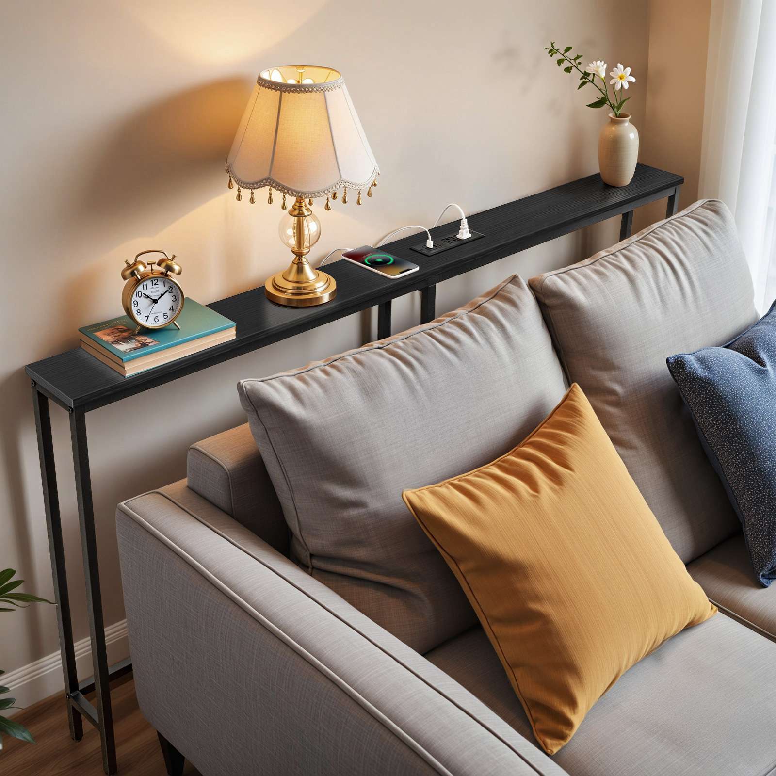 The 5.9" wide narrow sofa table is skinny enough to fit behind your couch, and allows you to have a place for mobile phone, laptop, desk lamps or tablets. It is the perfect storage solution for tight spaces!
