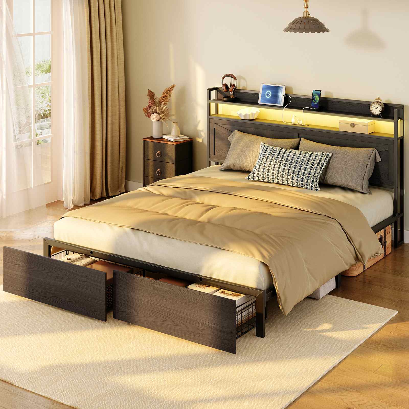 Queen Size Bed Frame, LED Bed Frame with Charging Station Headboard and 2 Storage Drawers Footboard, Sturdy Industrial Style Metal Platform Bed Frame, No Box Springs Needed, Black