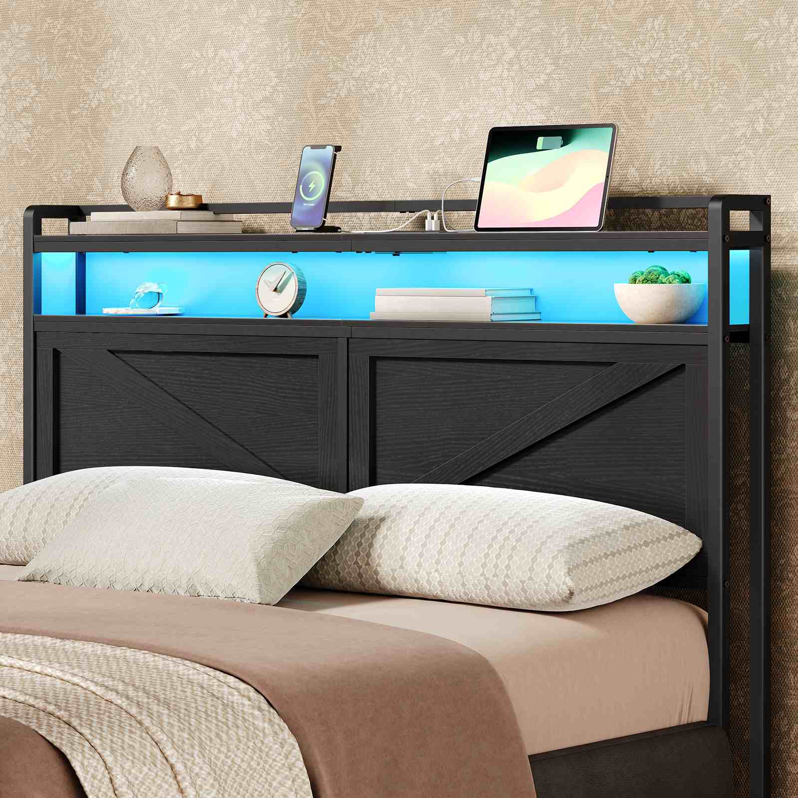 LED Headboard with Charging Station