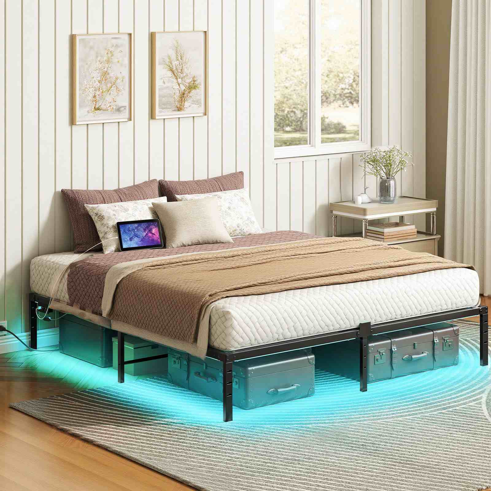 The bed frame features a charging outlet on the side, providing easy charging without hassle.The ample space under the bed allows for tidy and organized storage of belongings. metal bed frame, beautiful and functional, is the ideal choice for your bedroom!
