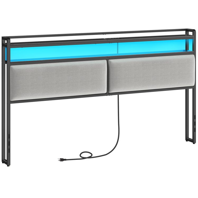 King Size Upholstered Headboard, Storage Headboard with Charging Station and Adjustable LED Lights, 2 Standard Outlets and 2 USB Ports, King Headboard Only, Easy Assembly, Black and Gray
