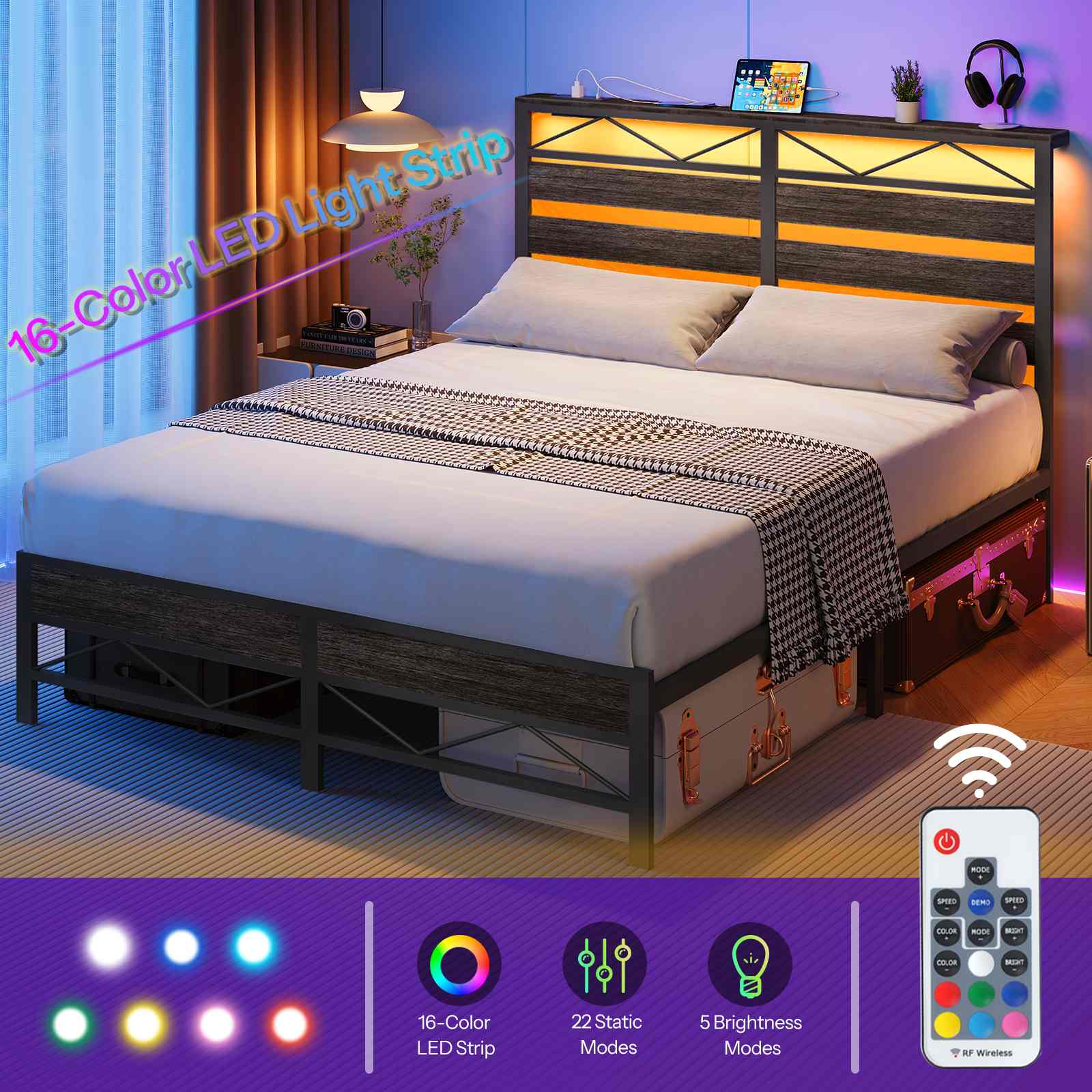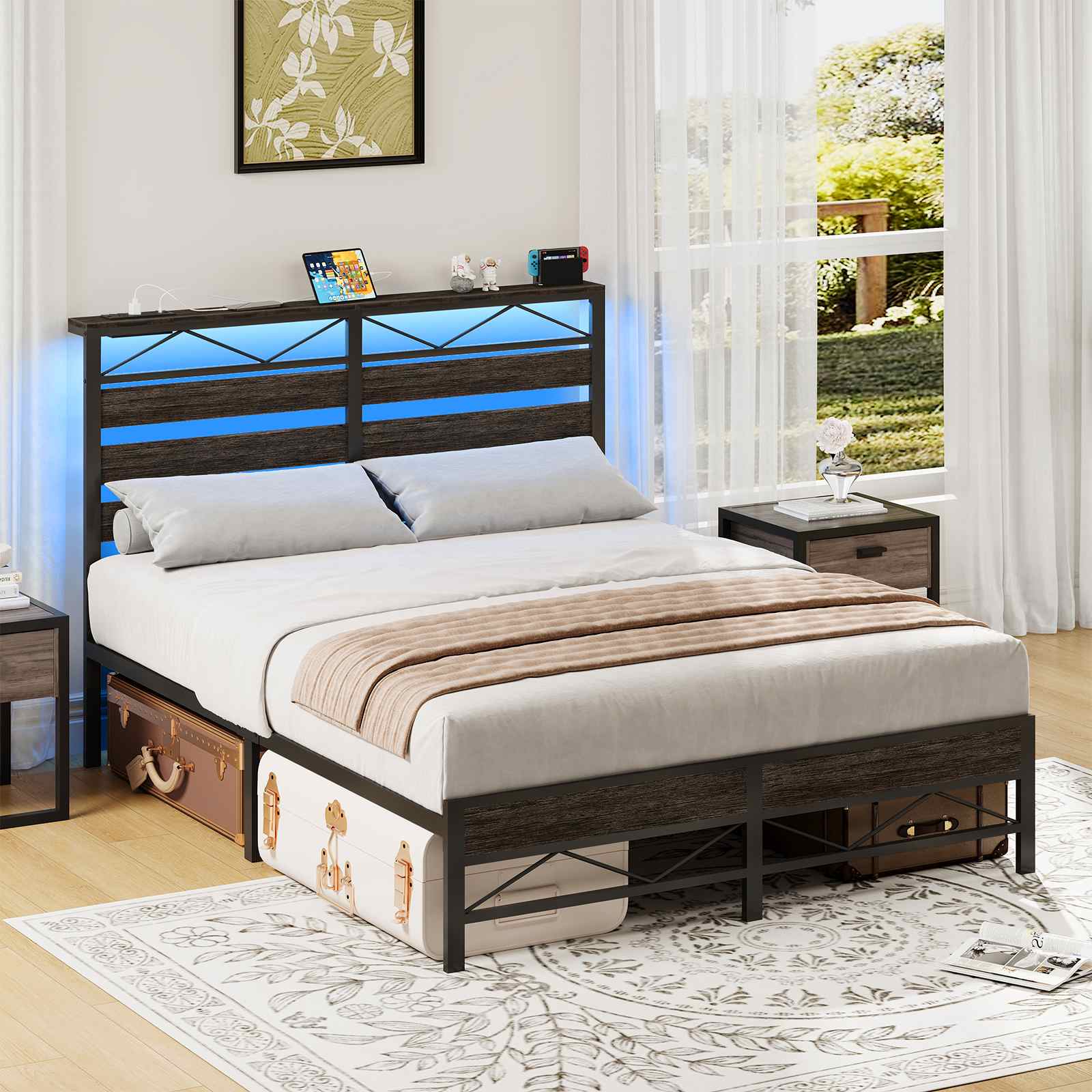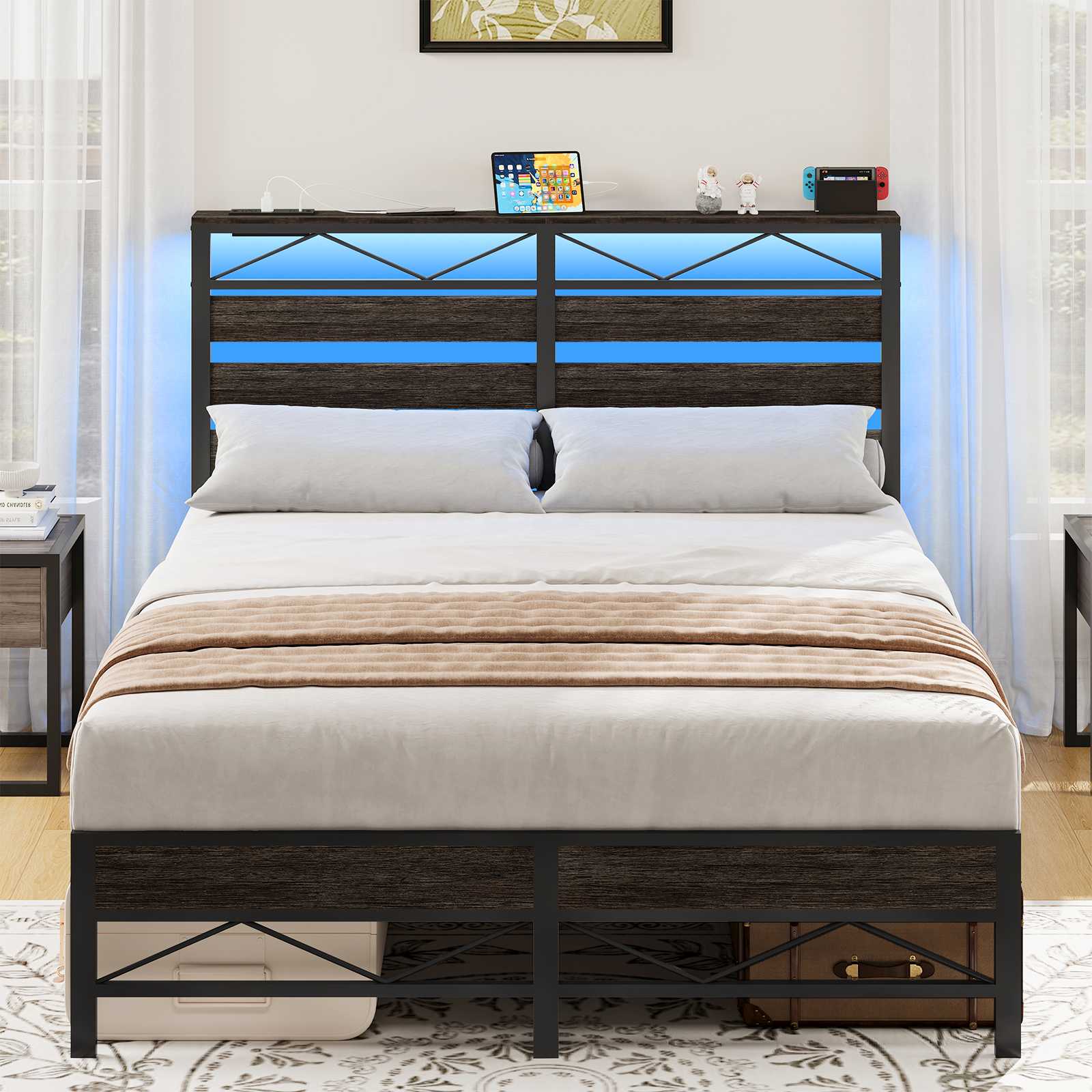 Full Size Bed Frame with Headboard, LED-Integrated Design with Storage Headboard and Charging Station (2 Outlets + 2 USB Ports), Charcoal Black Metal Bed Frame