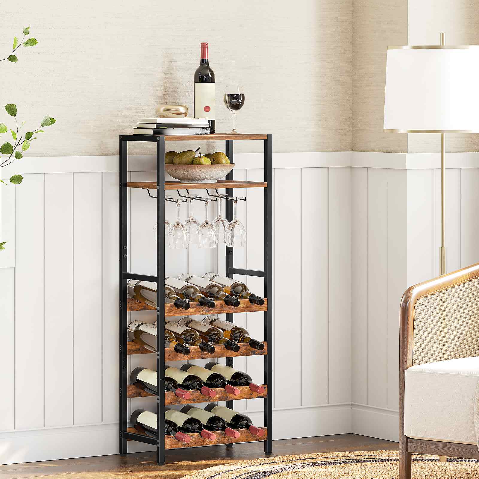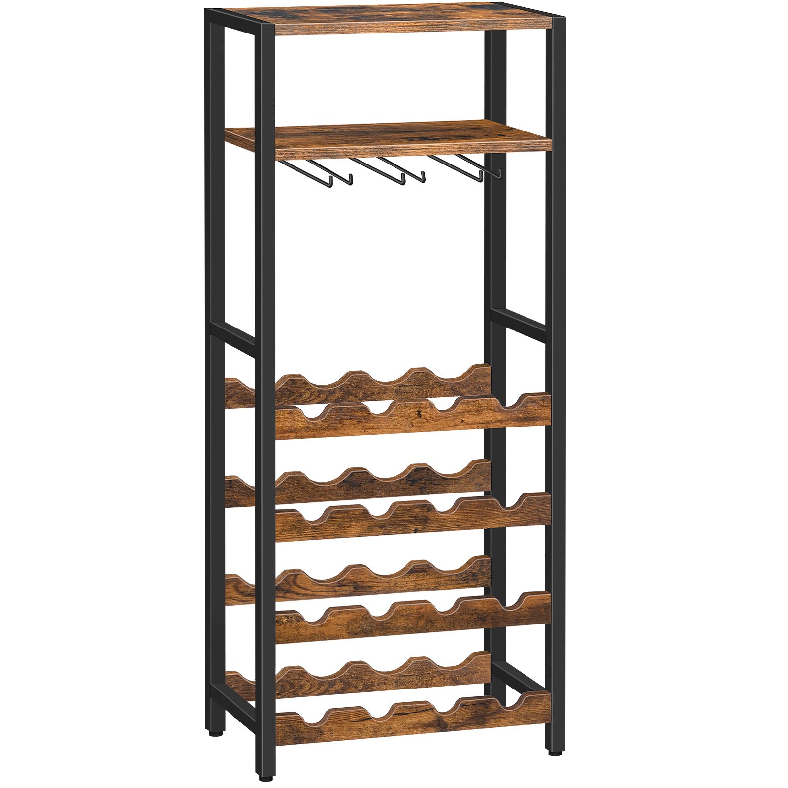 Freestanding Rustic Brown 6-Tier Wine Rack, 16-Bottle Storage Unit with Tabletop and Glass Holder, Suitable for Kitchen, Bar and Dining Room
