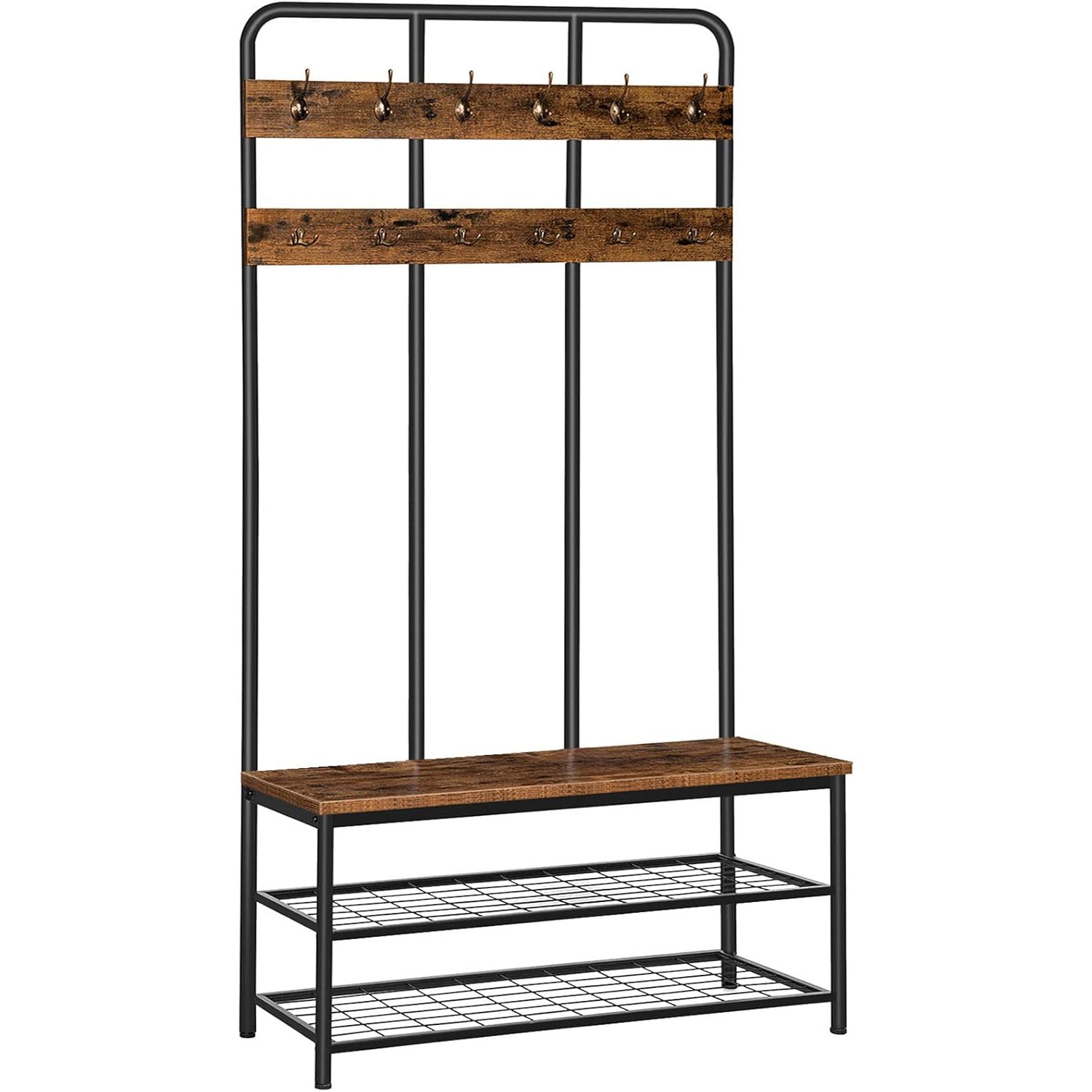 Thoughtful Storage Design: Equipped with 12 double hooks arranged in 2 rows for hanging clothing, and an extended 2-tier shoe bench, this hall tree simplifies entryway organization by accommodating the entire family’s footwear.