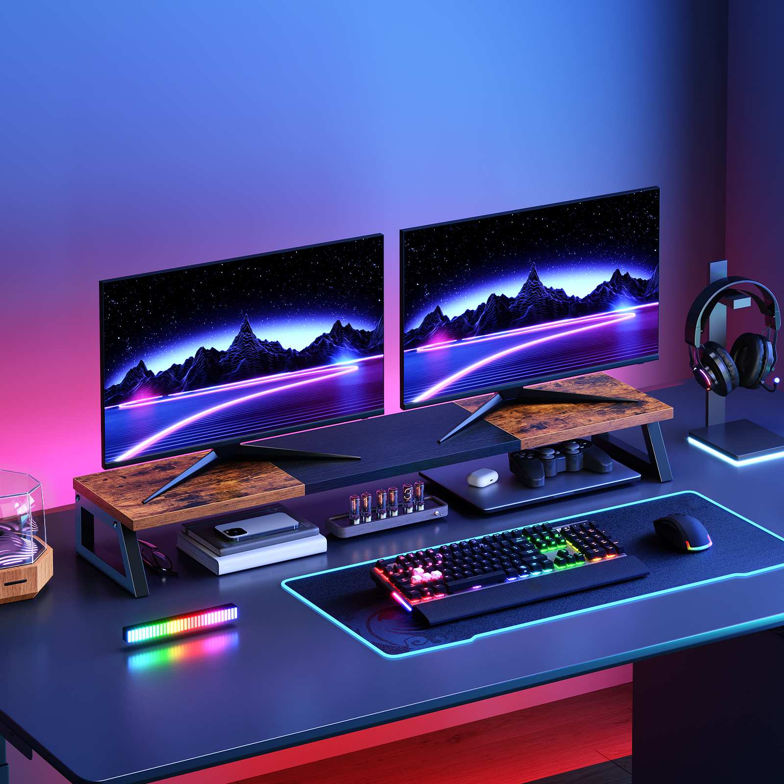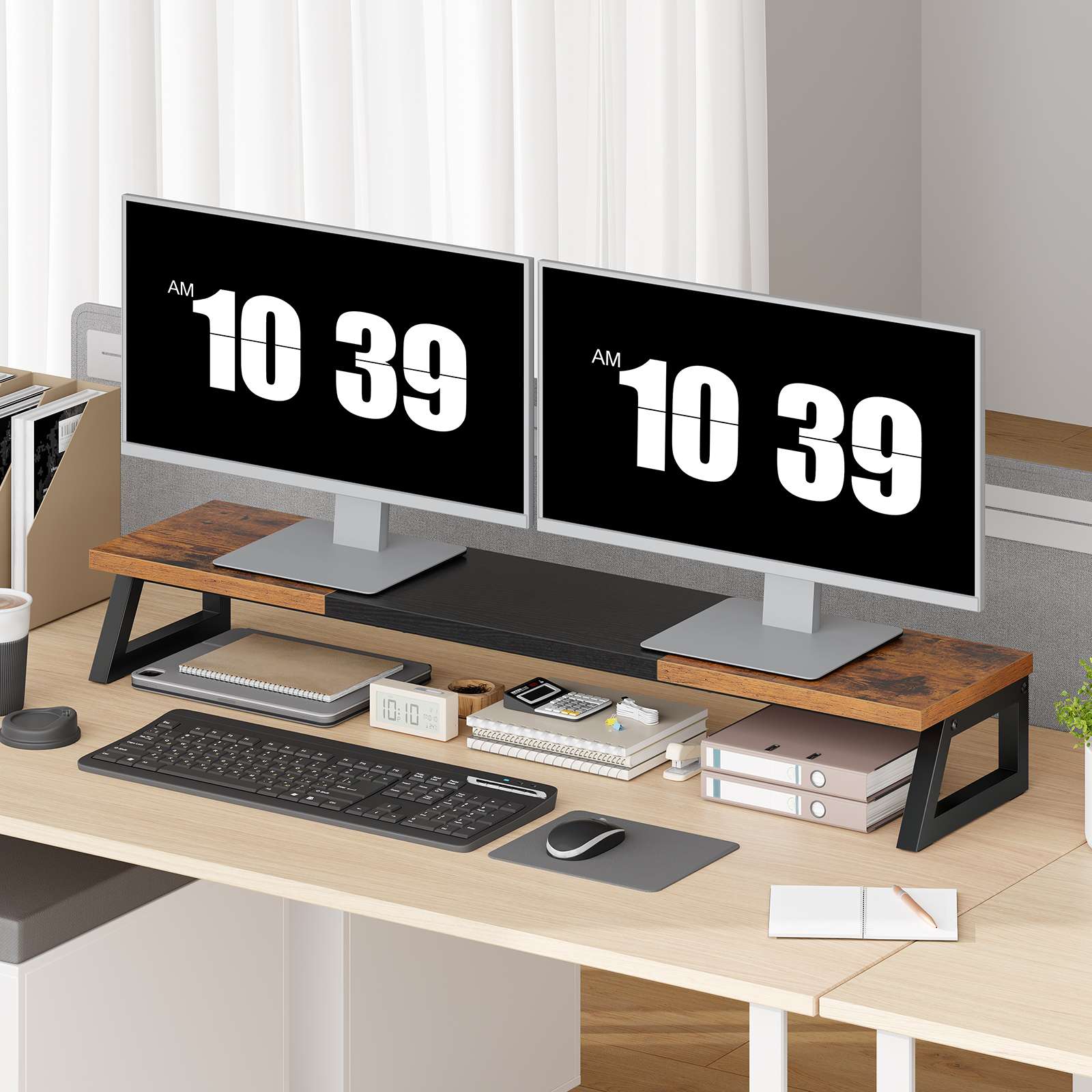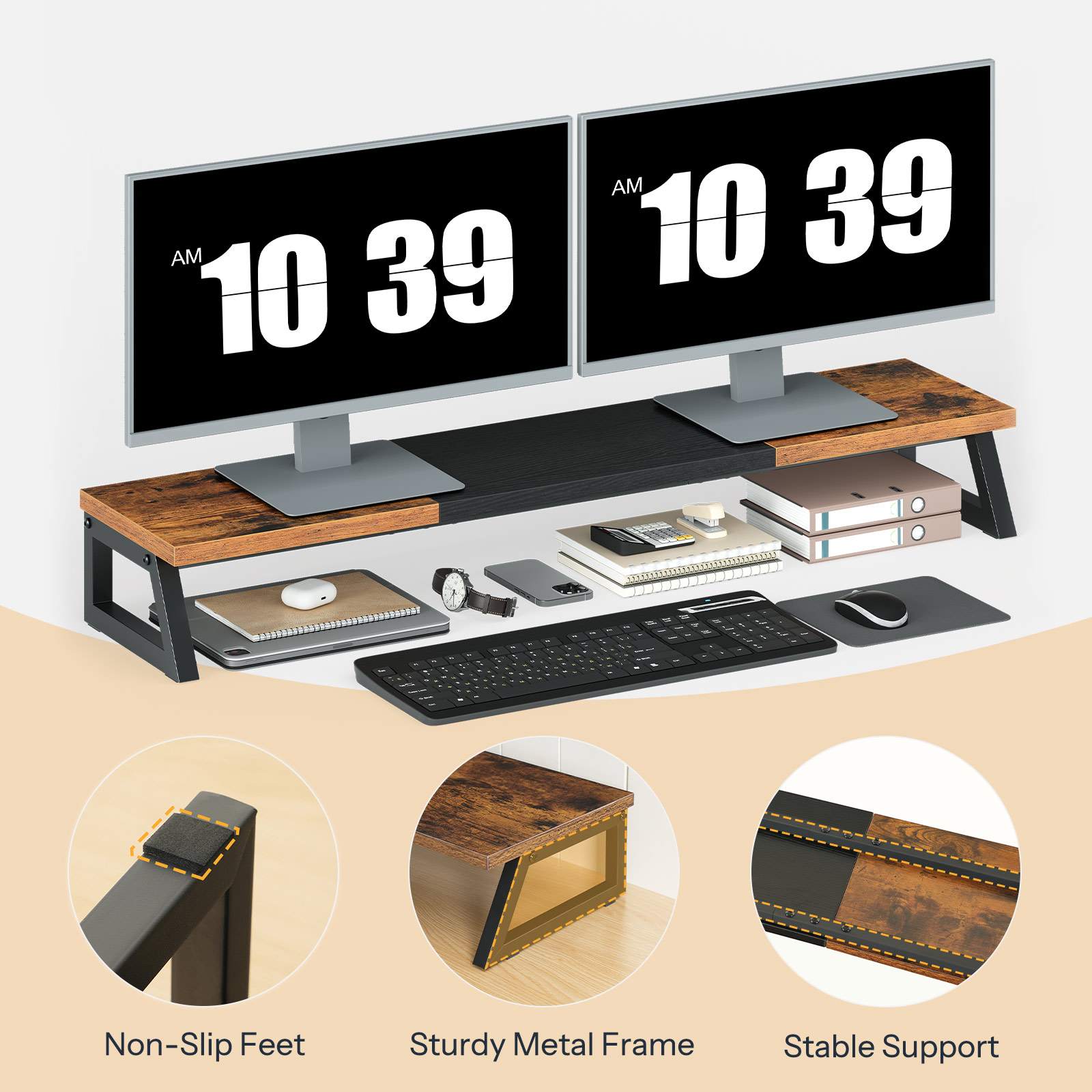Dual Monitor Stand Riser, 39-Inch Large-Surface Monitor Elevation Shelf for 2 Monitors, Multi-Functional Desk Organizer for Office Workspace & Accessories, Rustic Brown & Black