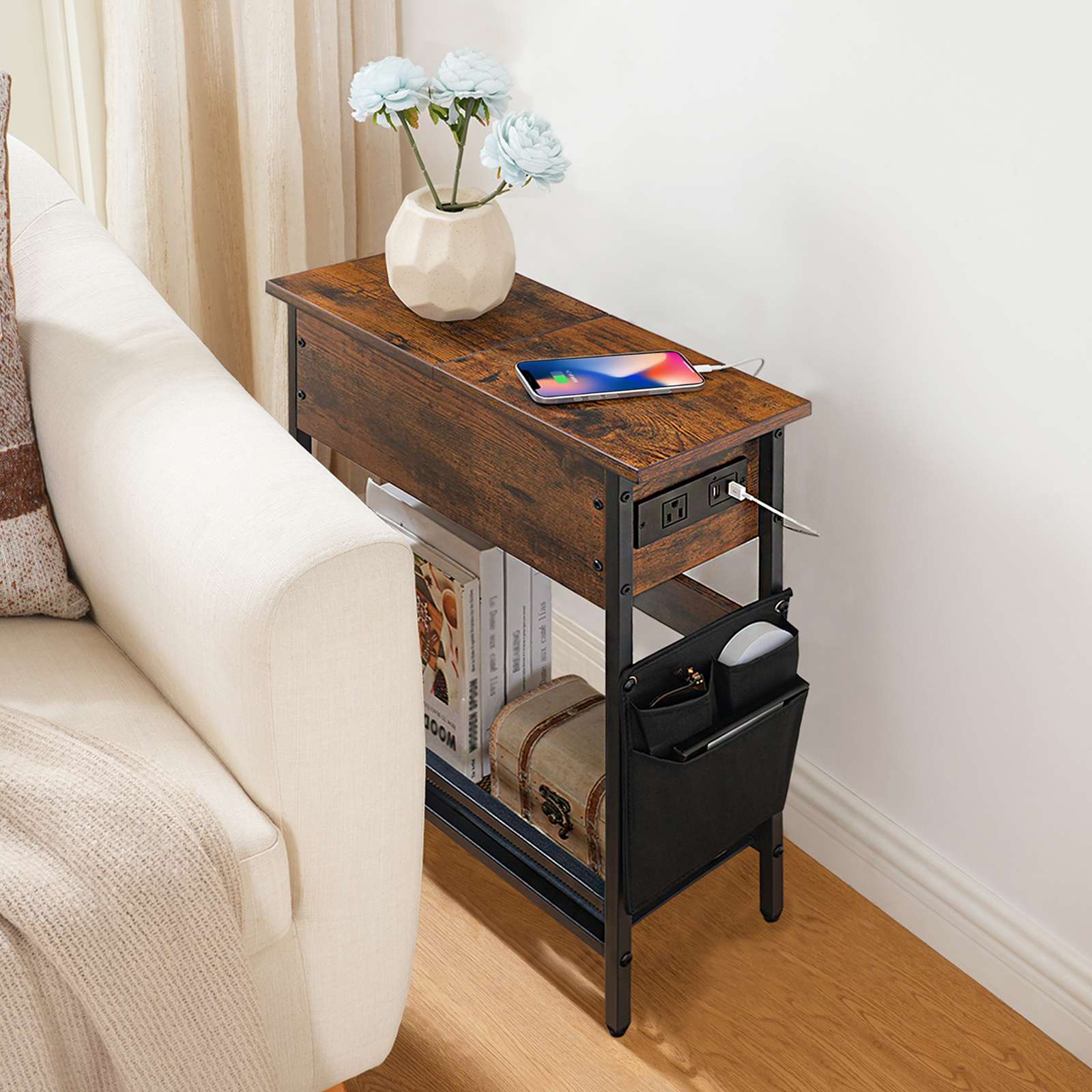 Narrow End Table with Charging Station, Flip-Top Slim Side Table, Multi-Functional Bedside Nightstand with Storage, Suitable for Small Spaces, Living Room & Bedroom, Rustic Brown & Black