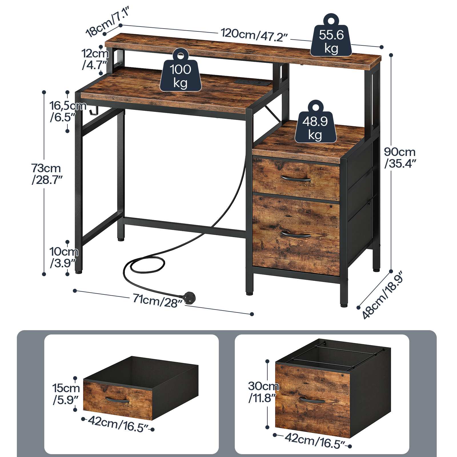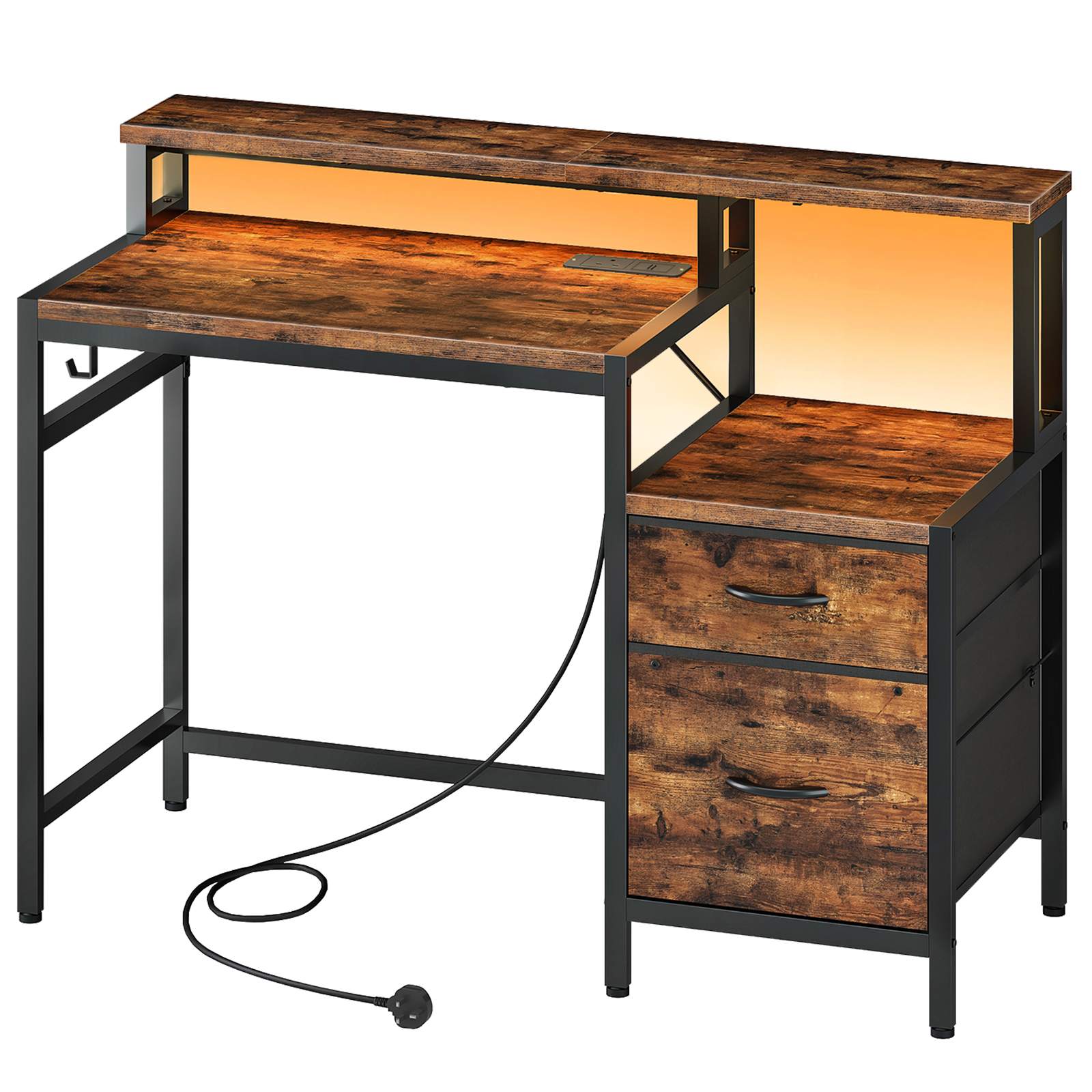 120cm Industrial Rustic Brown & Black Computer Desk with Fabric Drawers, Integrated Power Outlet & LED Lighting, Ergonomic Office Desk with Monitor Stand for Home Office, Study & Living Room