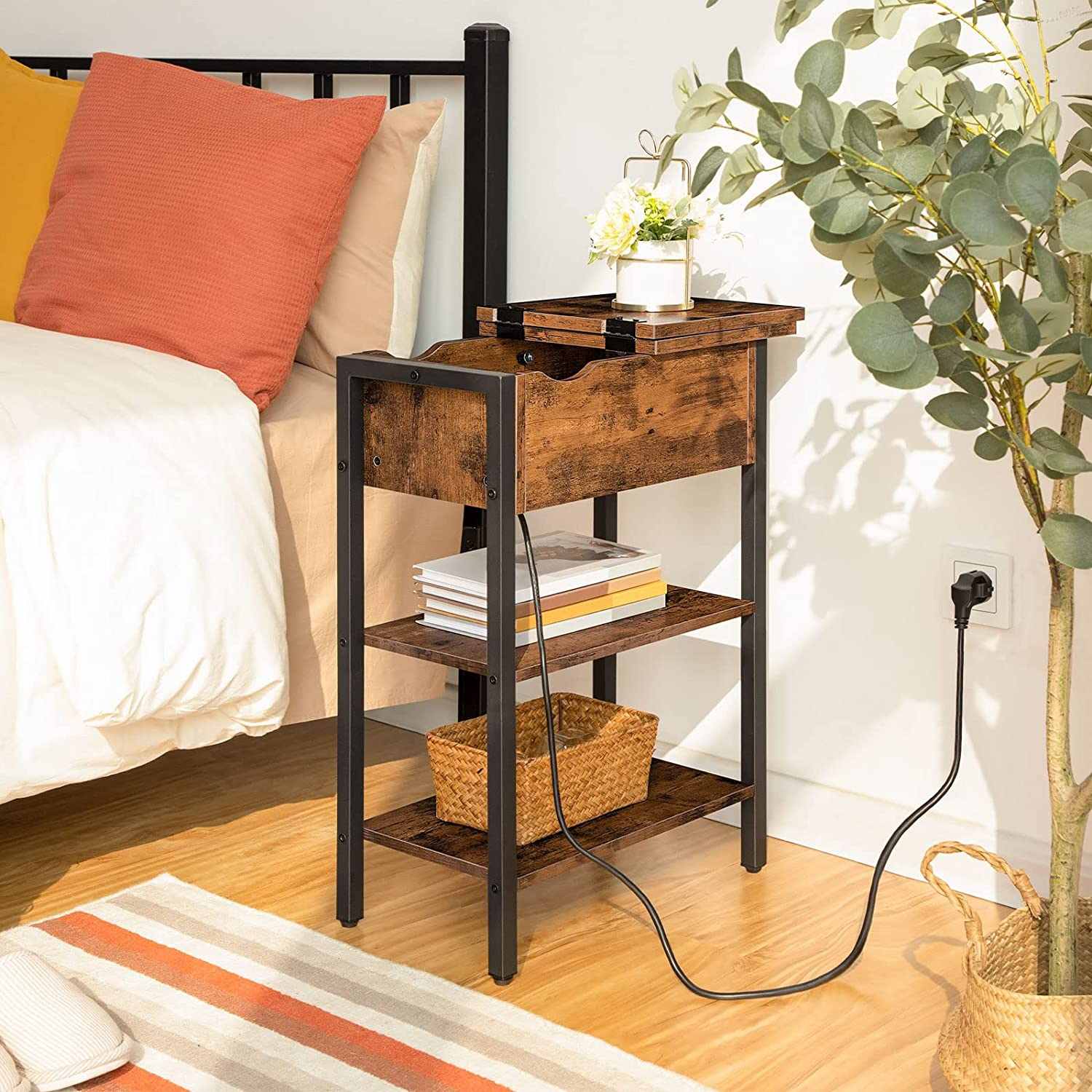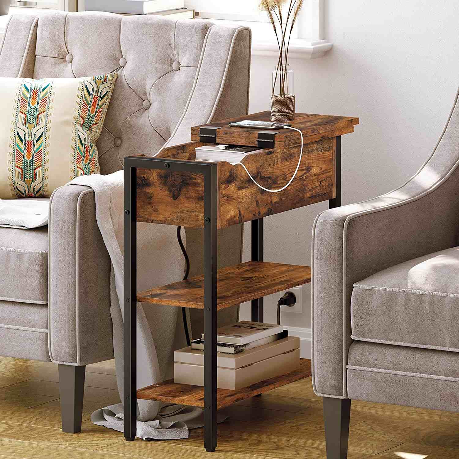 Side Table, Flip Top Sofa Table with Charging Station and Shelf, Narrow Bedside Table for Small Rooms, Bedroom, Living Room, Sturdy, Rustic Brown
