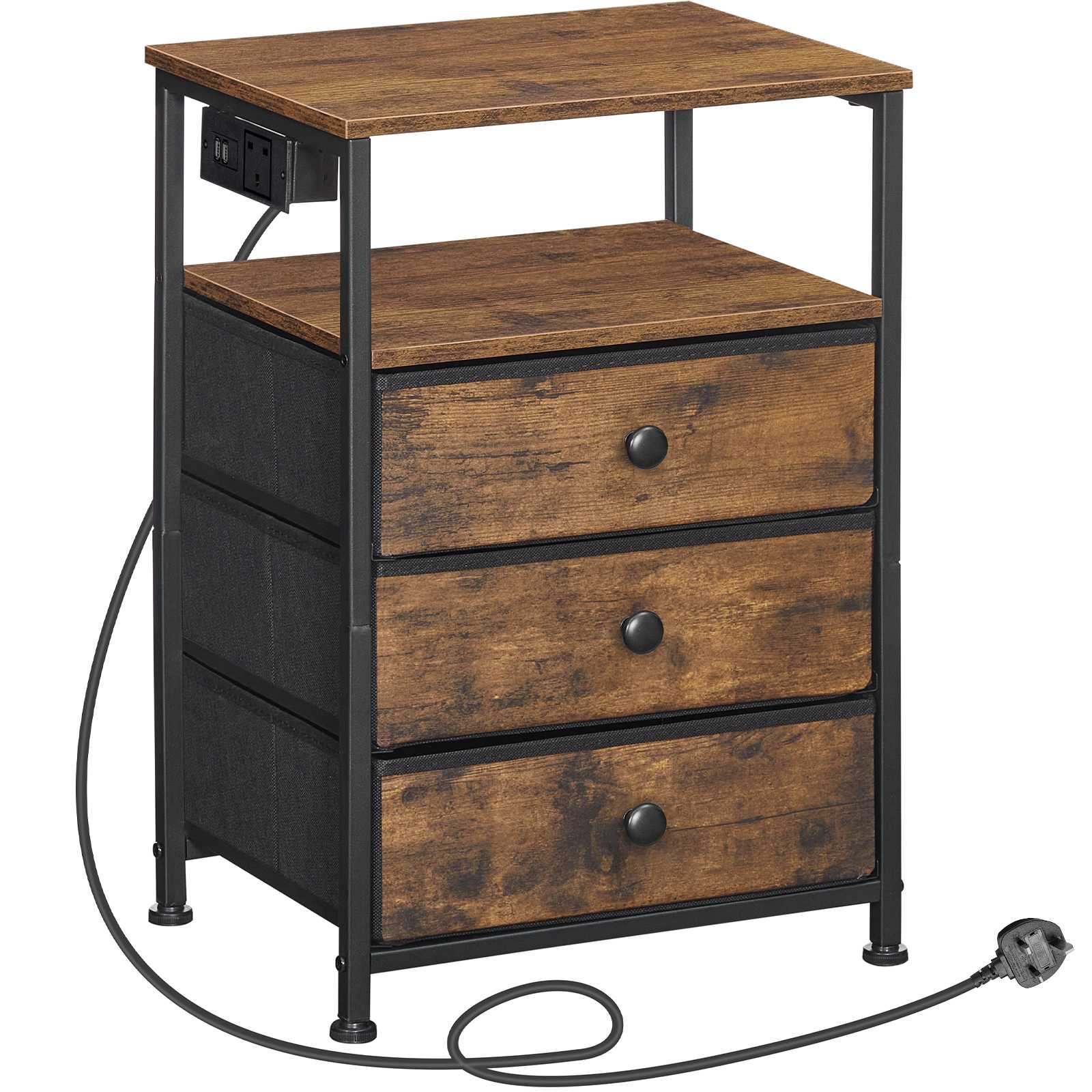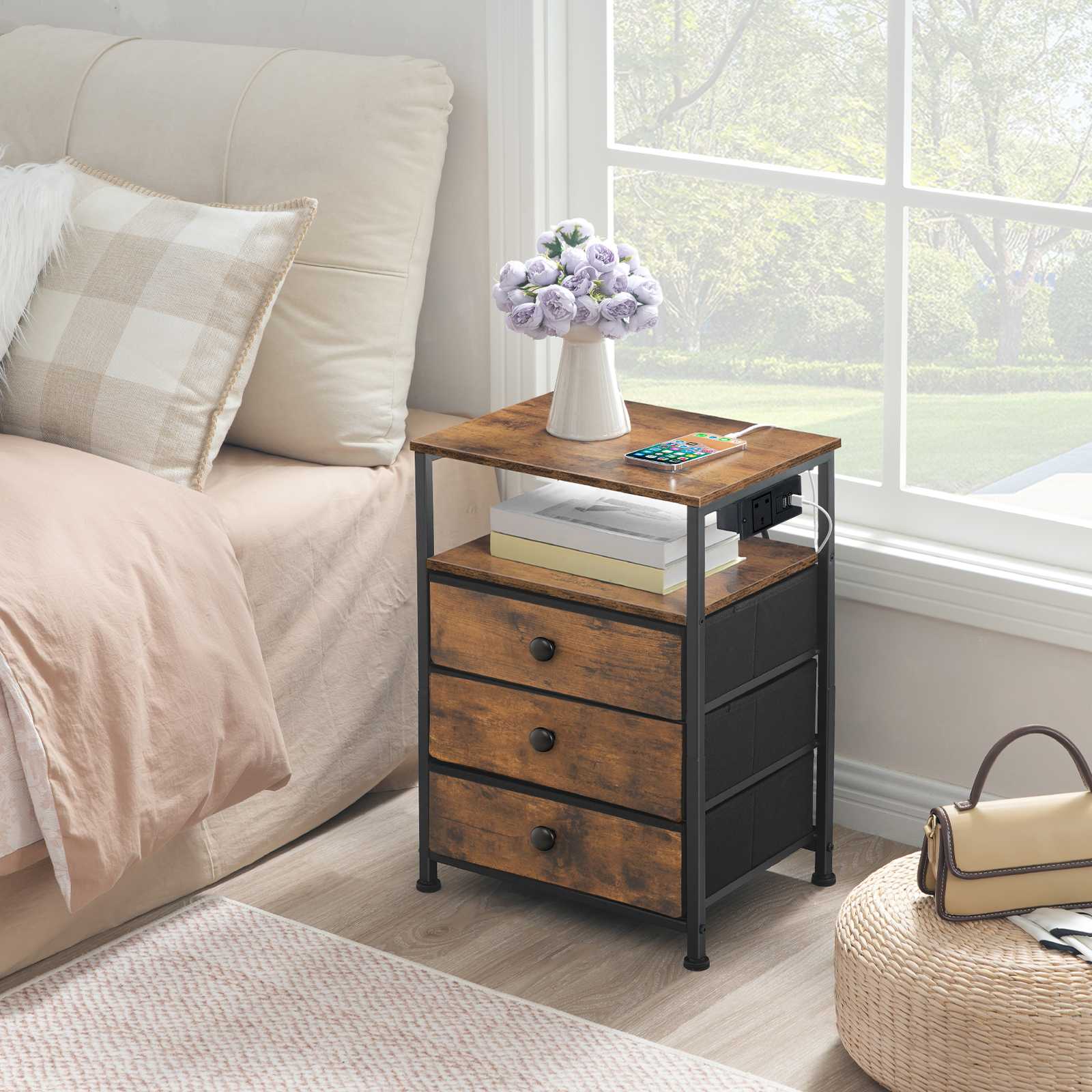 Bedside Table with Charging Station, Rustic Brown and Black End Table Featuring 3 Fabric Drawers, Sofa Side Table Equipped with USB Ports and Power Socket, Multifunctional Nightstand for Bedroom and Living Room