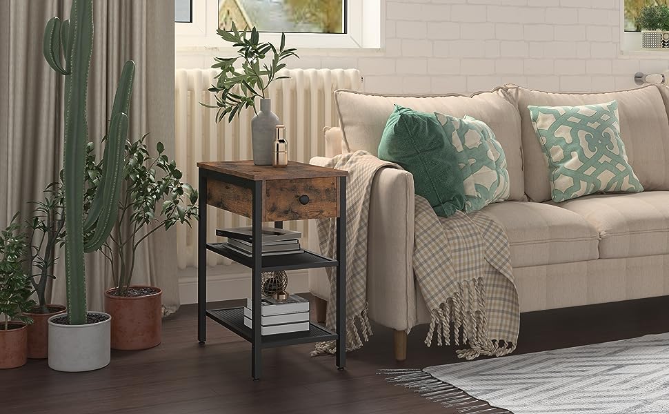 side table, industrial end table with drawer and 2 open mesh shelves, narrow nightstand for small spaces, bedroom, living room, office, space saving, stable metal frame, rustic brown
