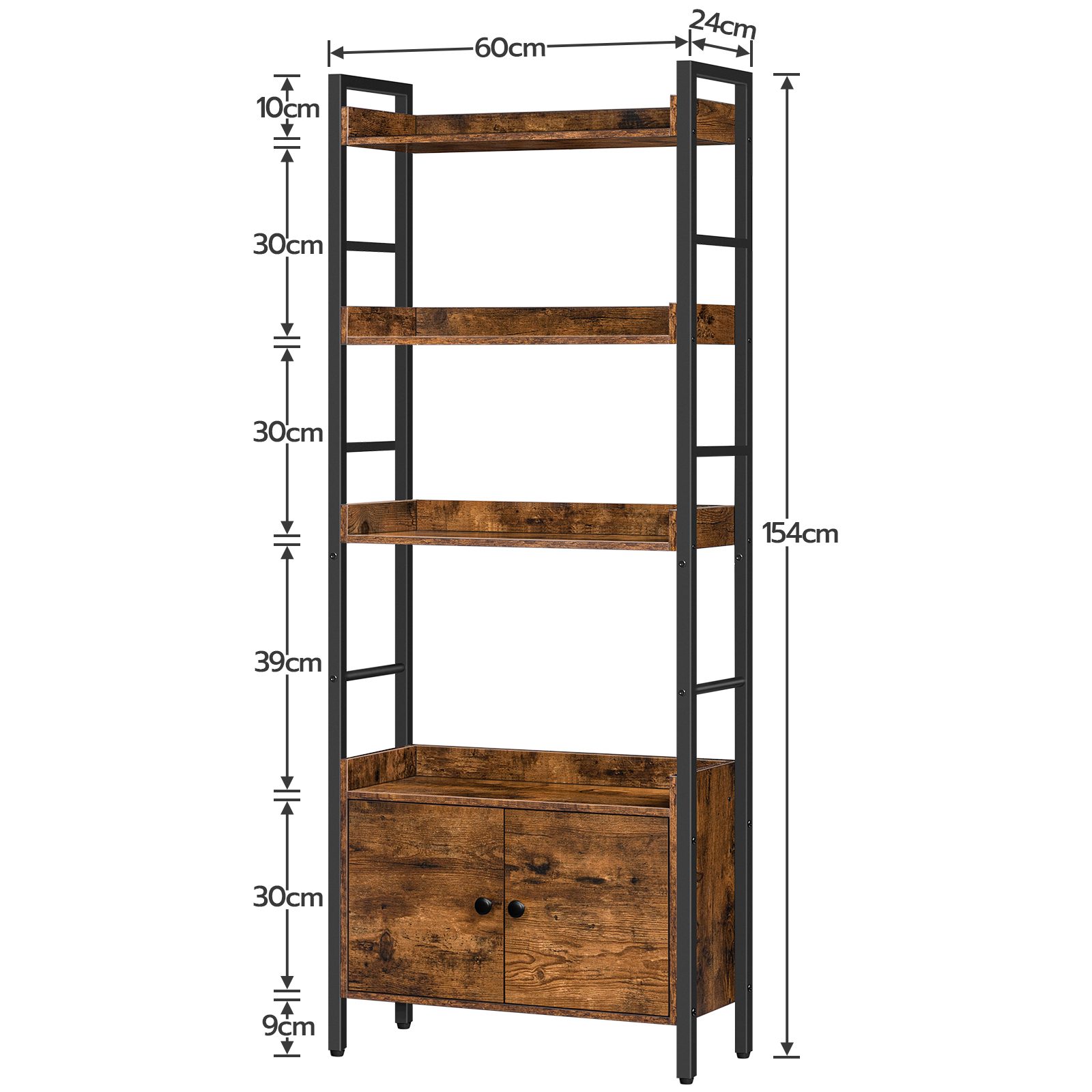 4-Tier Bookshelf with Doors, Industrial Rustic Brown & Black Wooden Bookcase with Storage, Storage Shelf with Protective Rails, Suitable for Living Room and Home Office