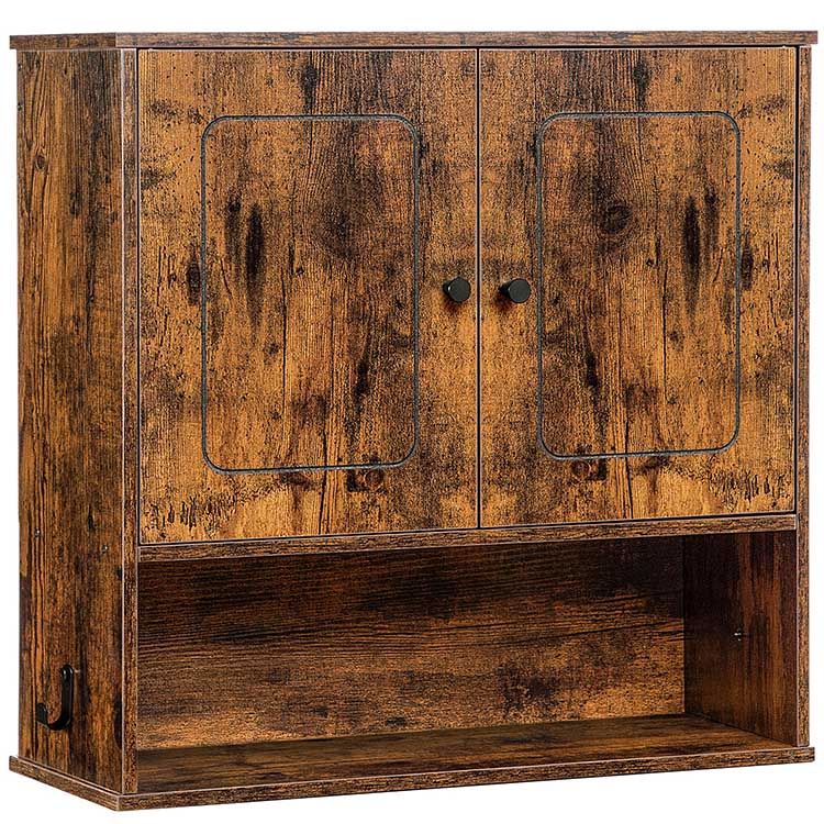 medicine cabinet, wall cabinet with 2 doors and adjustable shelf, wooden storage cabinet, medicine cupboard organizer with metal hooks, for kitchen, living room, rustic brown