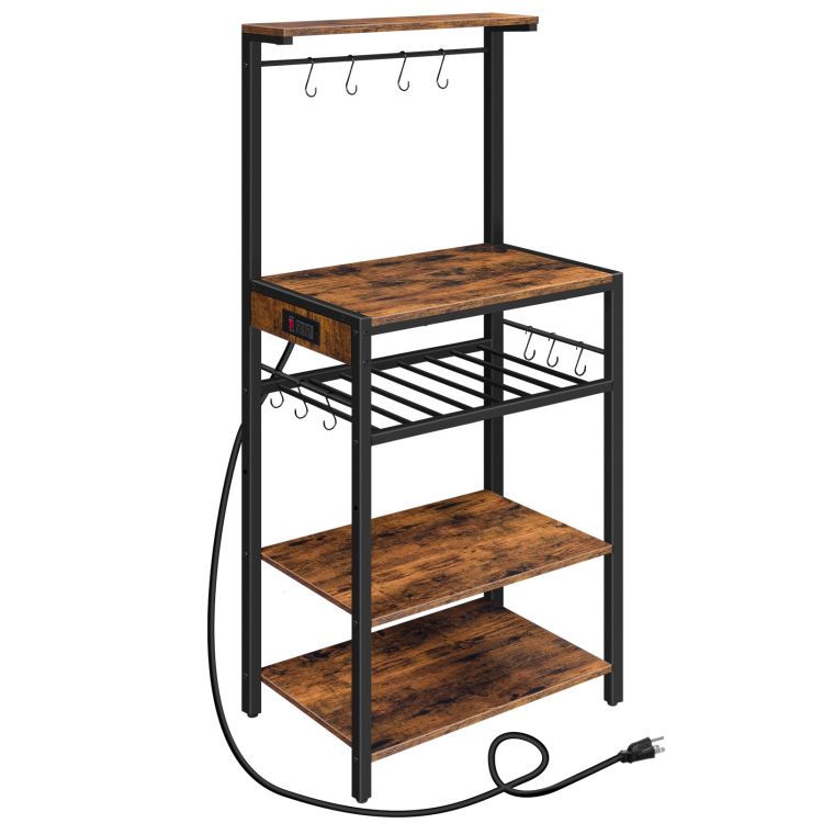 bakers rack with power outlet, 4-tier microwave stand with adjustable wine rack, coffee bar with 10 s-shaped hooks, for kitchen, living room, dinning room, rustic brown bf60uhb01