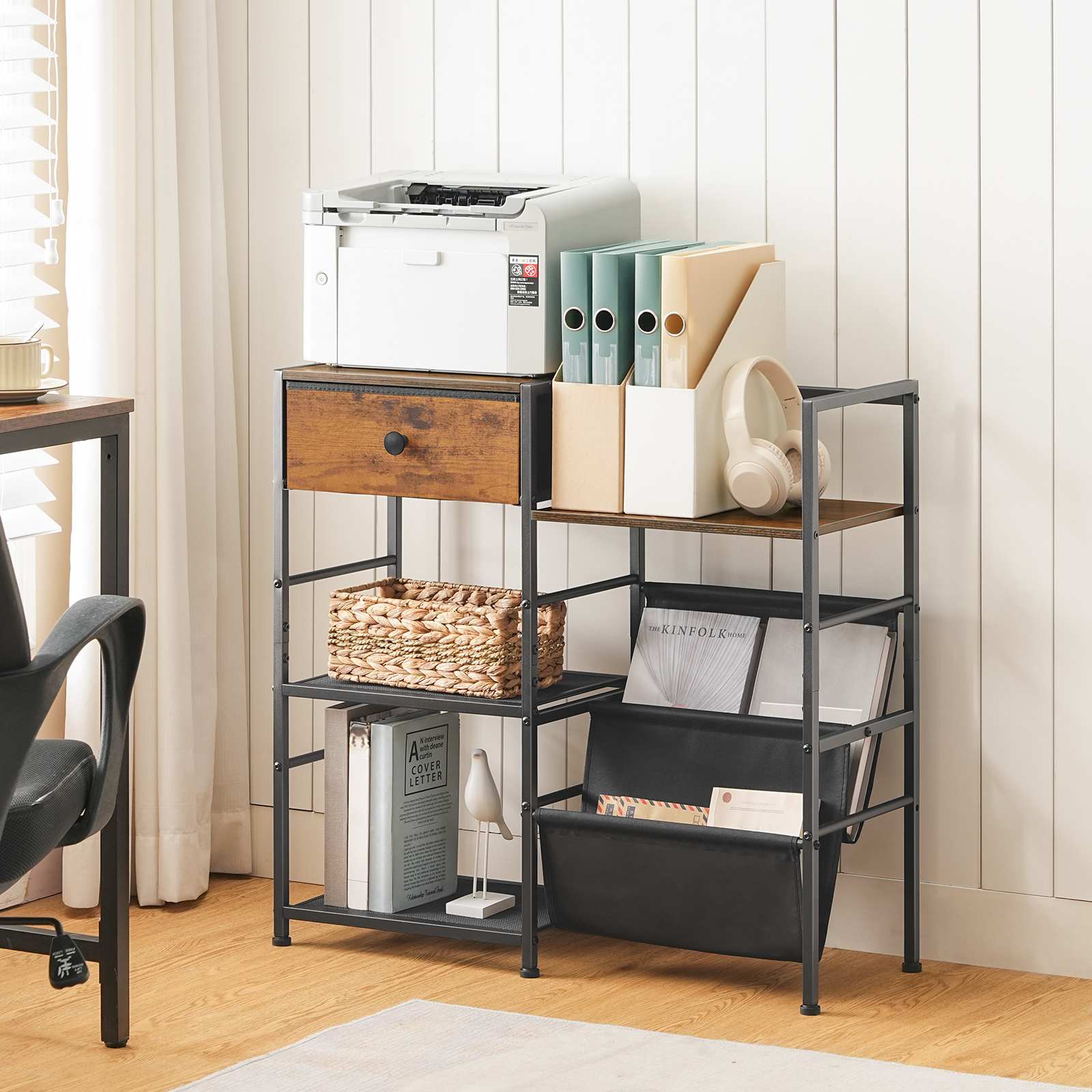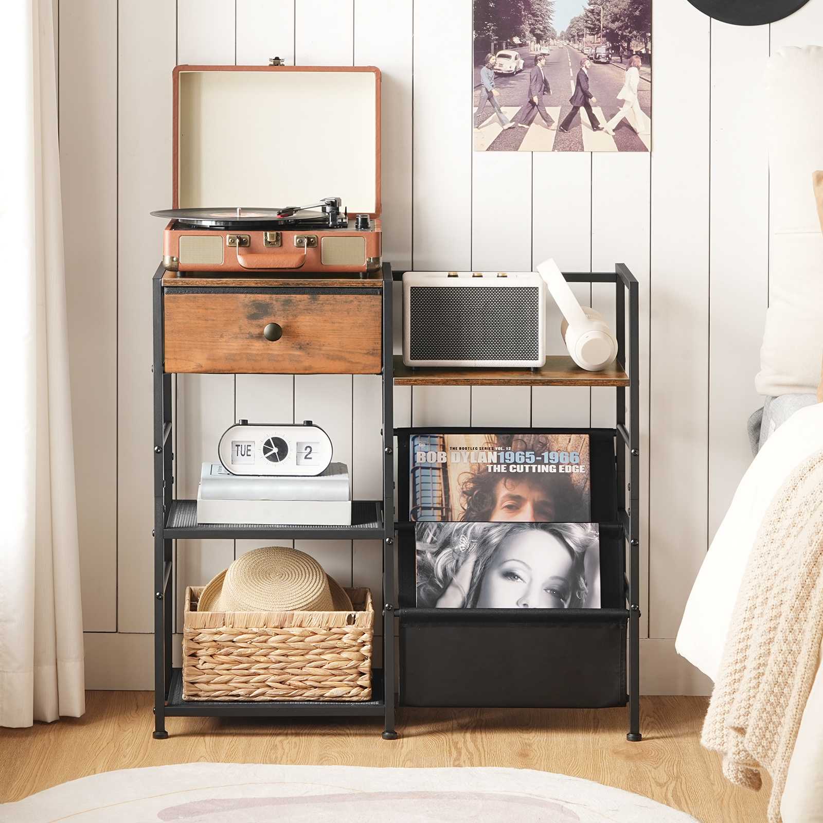 With additional drawer storage, it safely stores your vinyl records and other collectibles. The multi-level shelves and side non-woven fabric slings offer convenient record display.