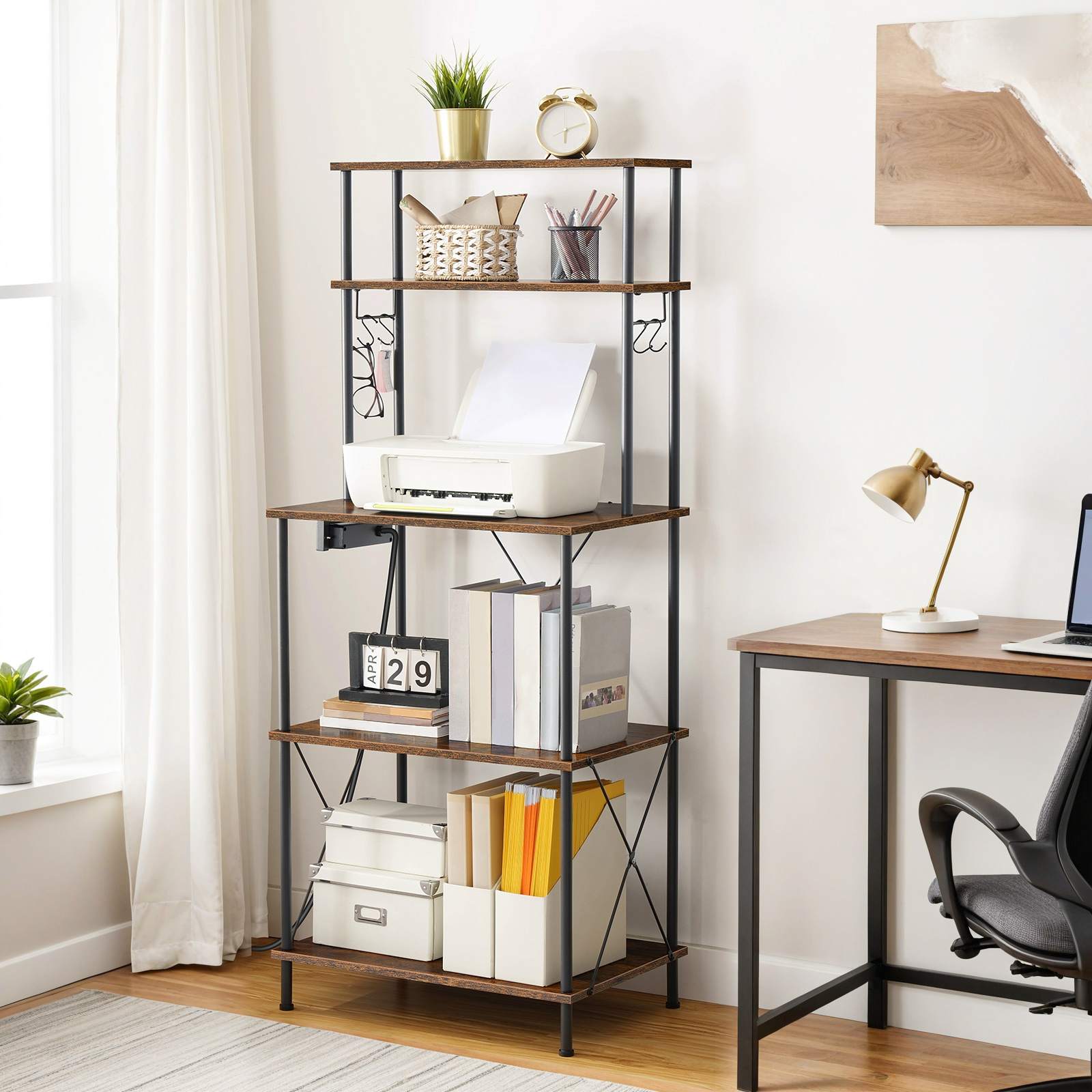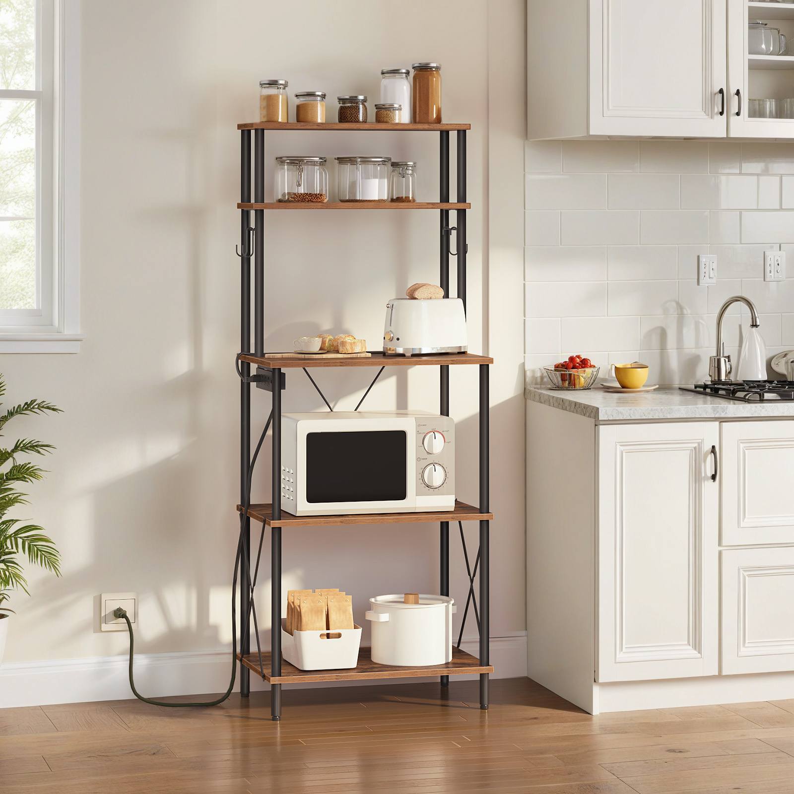 5-Tier Kitchen Baker's Rack with Power Outlets, Microwave Stand & S-Shaped Hooks, Multi-Functional Storage Rack for Coffee Bar, Living Room & Dining Room, Rustic Brown & Black