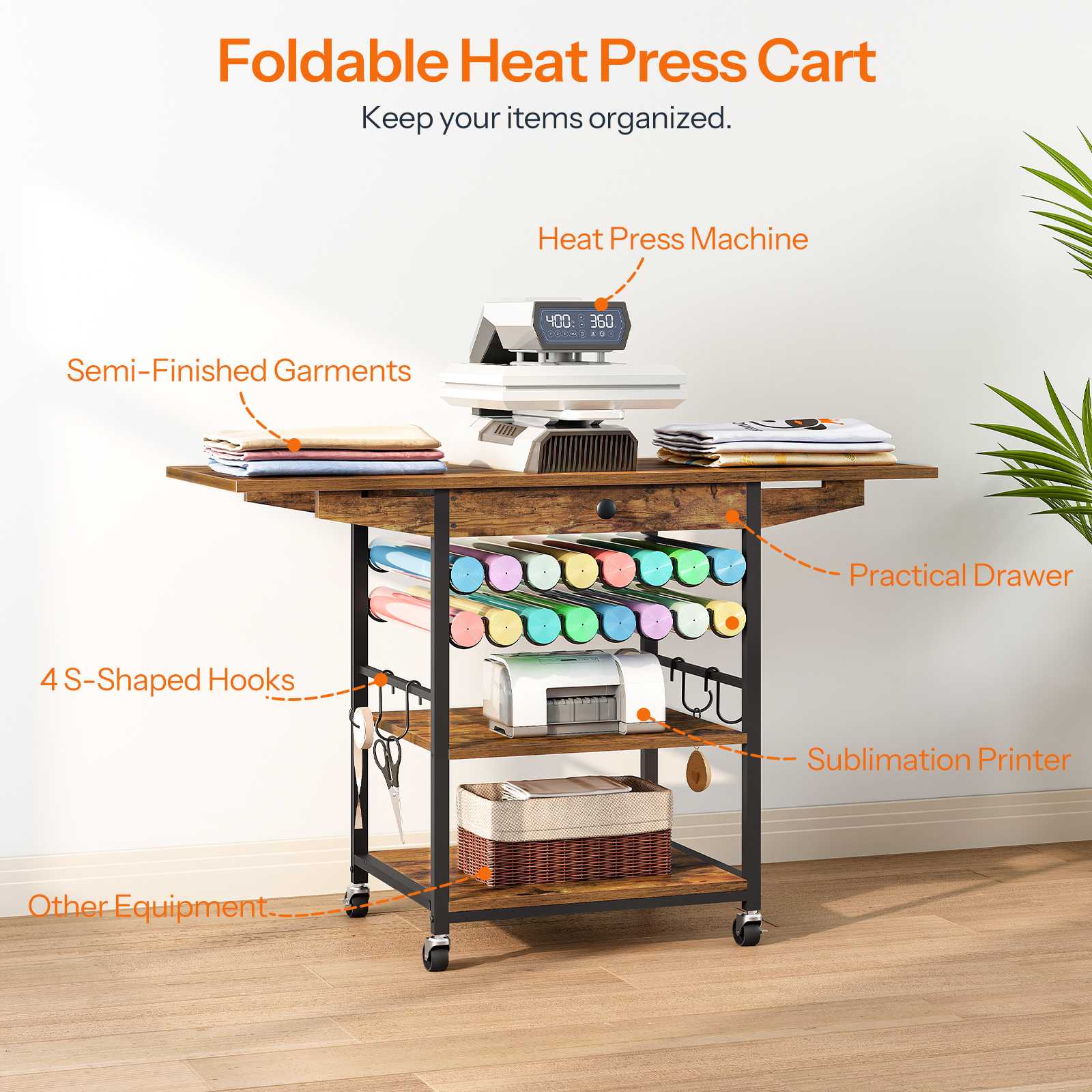 - All-in-One Storage: Our heat press table includes 3 shelves, a spacious drawer, and 2 foldable side panels for versatile storage. The wide tabletop holds heat transfer and cutting machines, while the adjustable middle shelf with S-hooks keeps tools organized and within reach