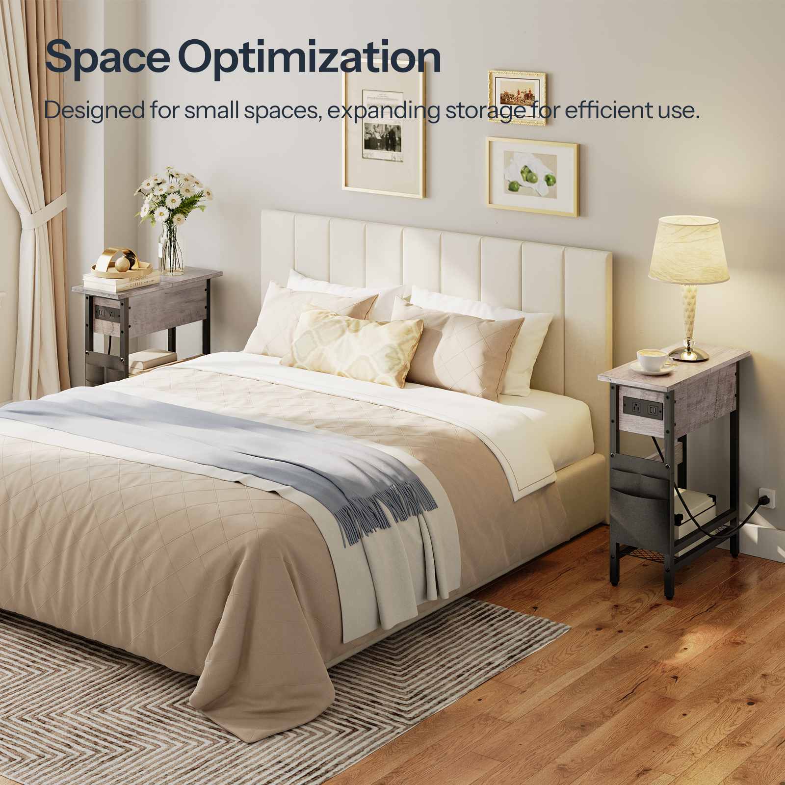 Integrated Efficient Charging System: This slim end table is equipped with a built-in charging module, including 1 AC outlet and 2 USB ports, which supports simultaneous charging of up to 3 electronic devices. This configuration effectively addresses the issue of insufficient charging interfaces in home environments, while the 149.9cm power cord provides flexible placement options to enhance daily usability.
