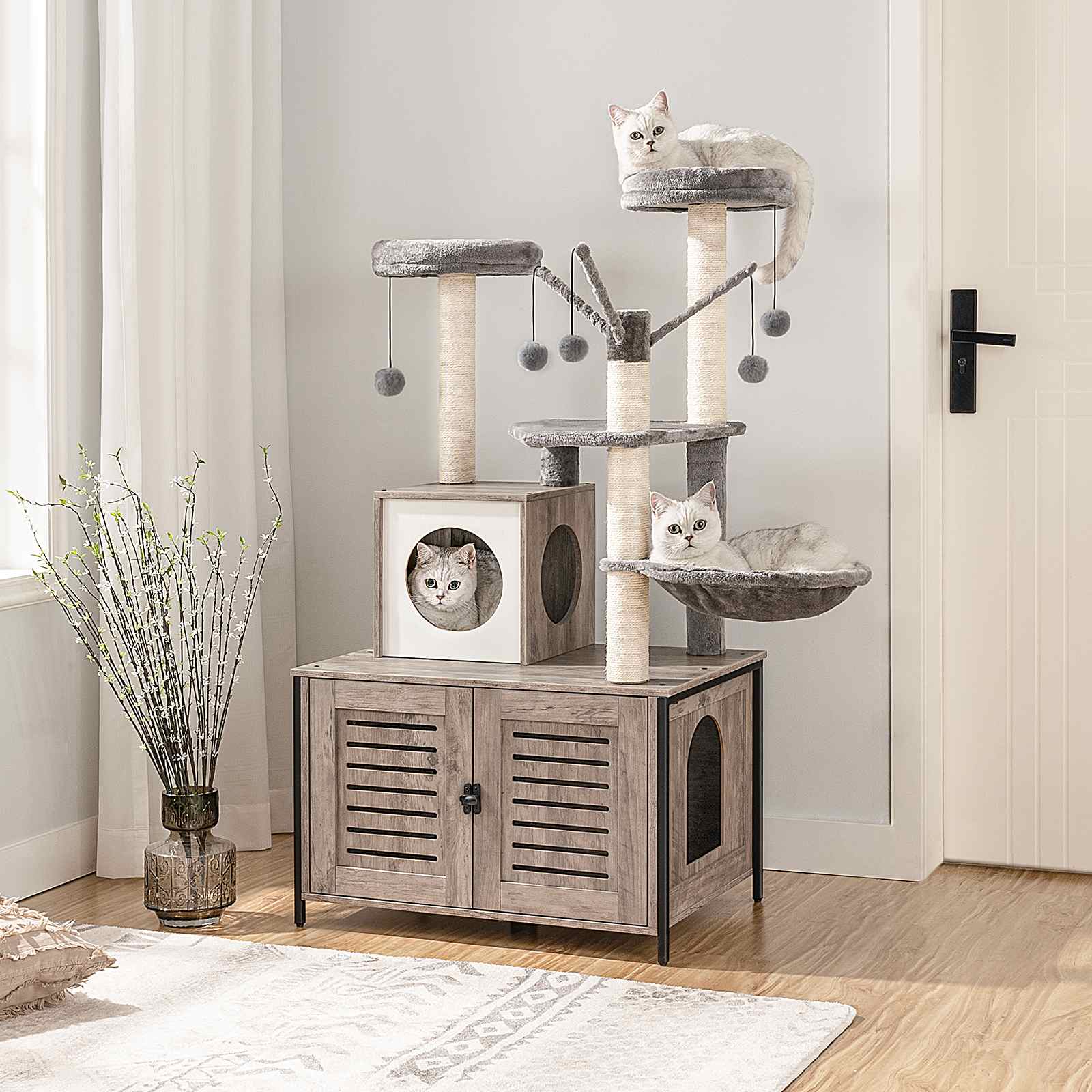 All-in-One Wooden Cat Tree with Litter Box Enclosure, Cat Tower with Scratching Posts, Hammock & Detachable Teaser Sticks for Indoor Cats, Grey