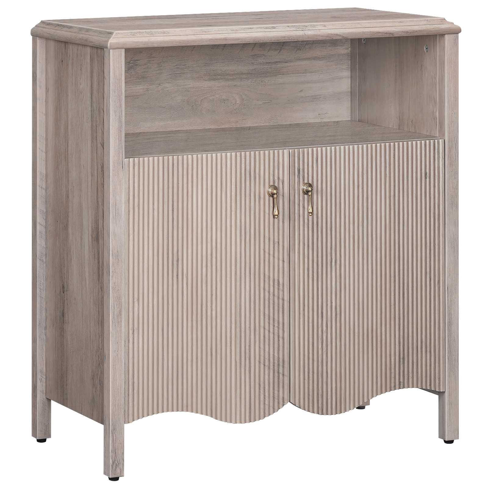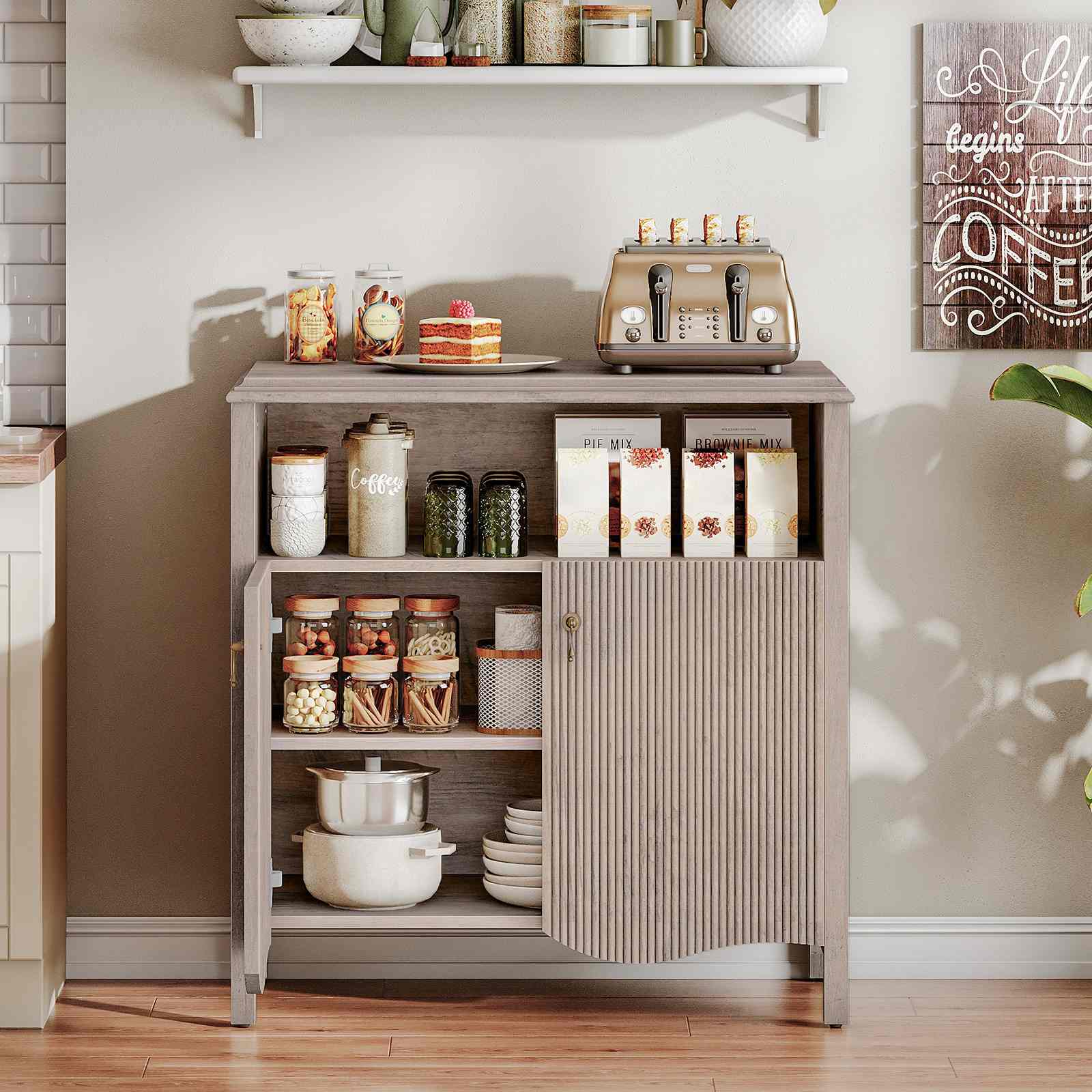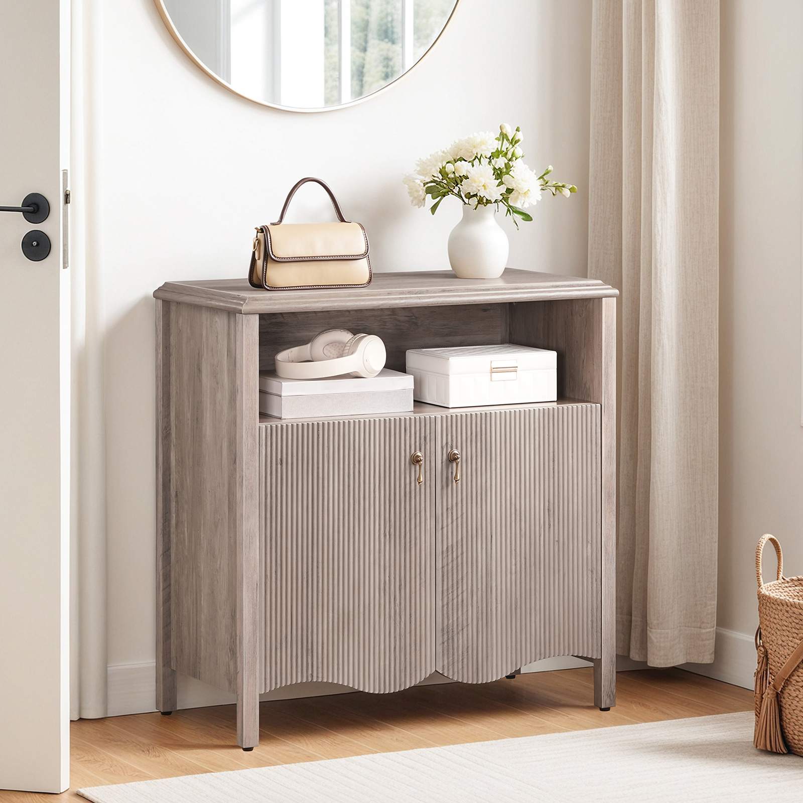HOOBRO Console Table, Storage Cabinet with Adjustable Shelf, Entryway Table, Engineered Wood Buffet Sideboard, Oriental Element Design, Greige, for Hallway, Entryway, Dining Room Oriental-Roof Design The edge of the top incorporates oriental elements, exuding artistic beauty. Wave Wood Grain Cabinet Doors Elegant and unique in shape, with a smooth and comfortable touch. Adjustable Shelves Three adjustable heights to flexibly hold various items.