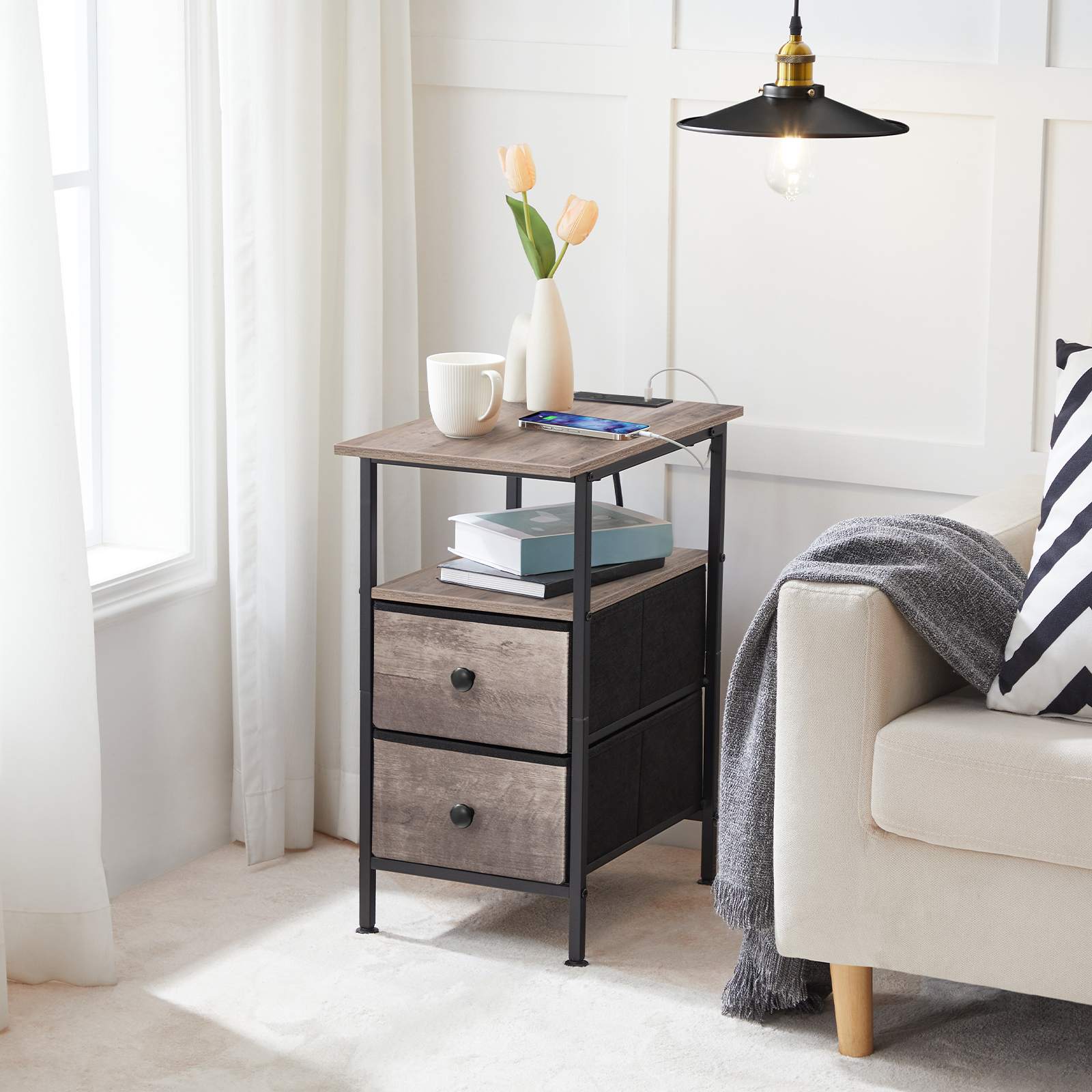 Narrow Side Table with Charging Station, Multifunctional Grey & Black Nightstand with 2 Non-Woven Drawers and Open Shelves, Slim Design for Small Spaces, Living Room & Bedroom