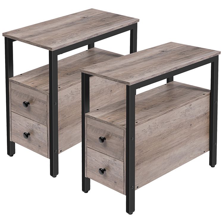 end table, set of 2, recliner side table with 2 drawer and open shelf, narrow nightstand for small space, in living room, bedroom, wood look accent table, grey and black