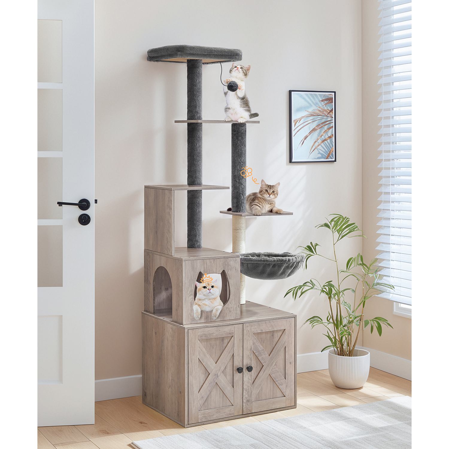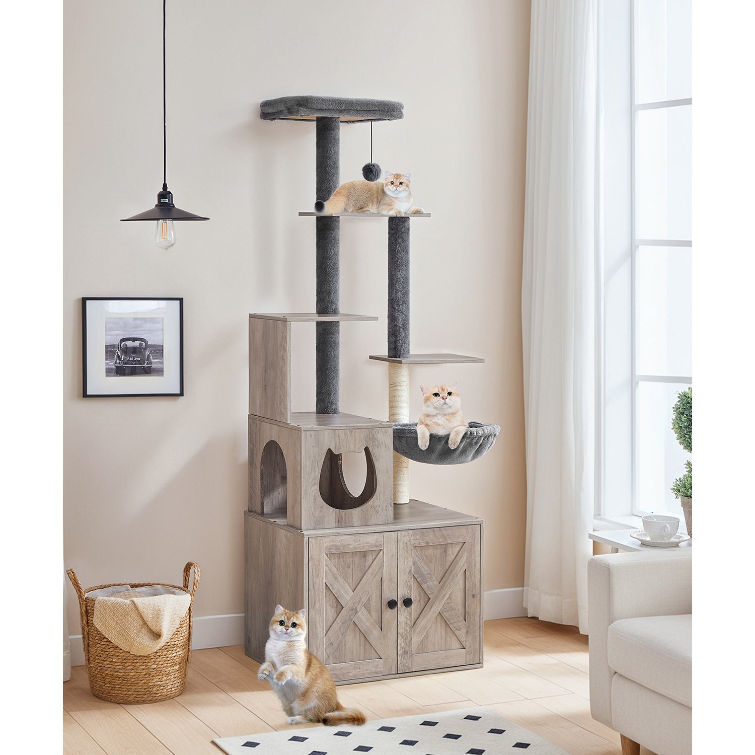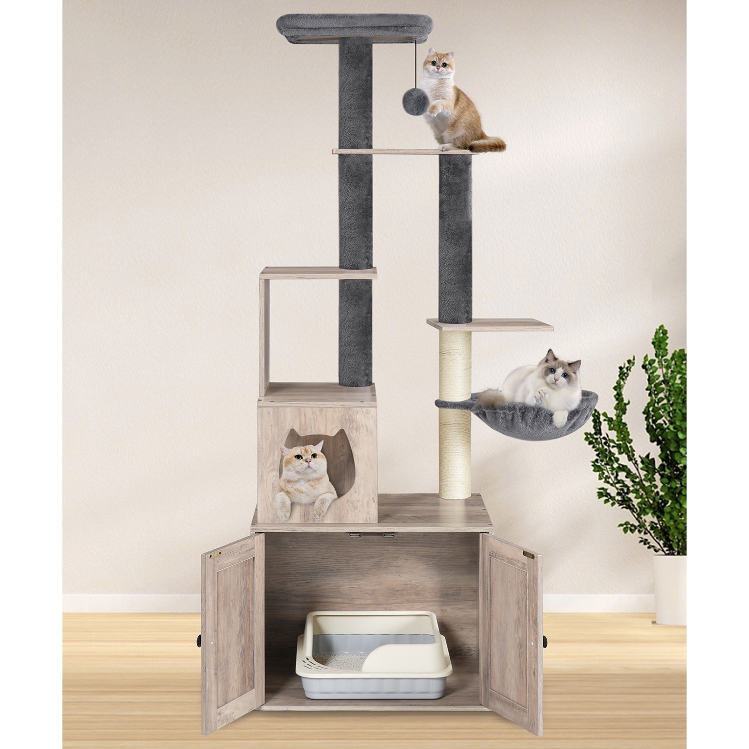 Cat Tree with Litter Box Enclosure, 172.0cm H Wooden Multifunctional Pet Furniture with Hidden Litter Box, Perch, Hammock and Scratching Post, Cat Tower for Indoor Cats, Grey