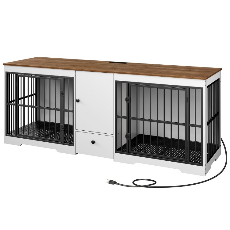 Walnut and White Dog Crate Furniture for 2 Dogs, Double Dog Cage Furniture with Storage Cabinet and Drawer