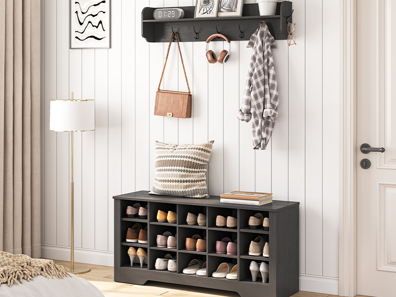 - entryway bench with coat rack: wall-mounted design can effectively use space. the solid panels of this coat rack can place small ornaments, green plants and 7 hooks can hang bags