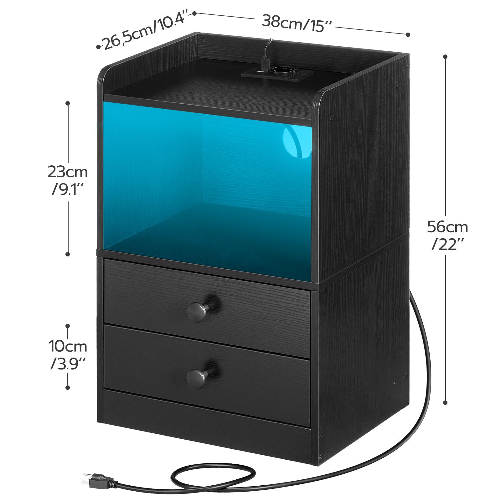 With this bedside table with socket, you have everything at hand. With 2 drawers and 2 shelves, it combines privacy and open storage. The interior of the drawer is spacious enough to store remote controls, snacks, medication, game controllers and more. Other things are placed on the shelf at a glance, so that daily necessities stay organized. Elegant and stylish appearance, perfect for living room, bedroom, home and office.