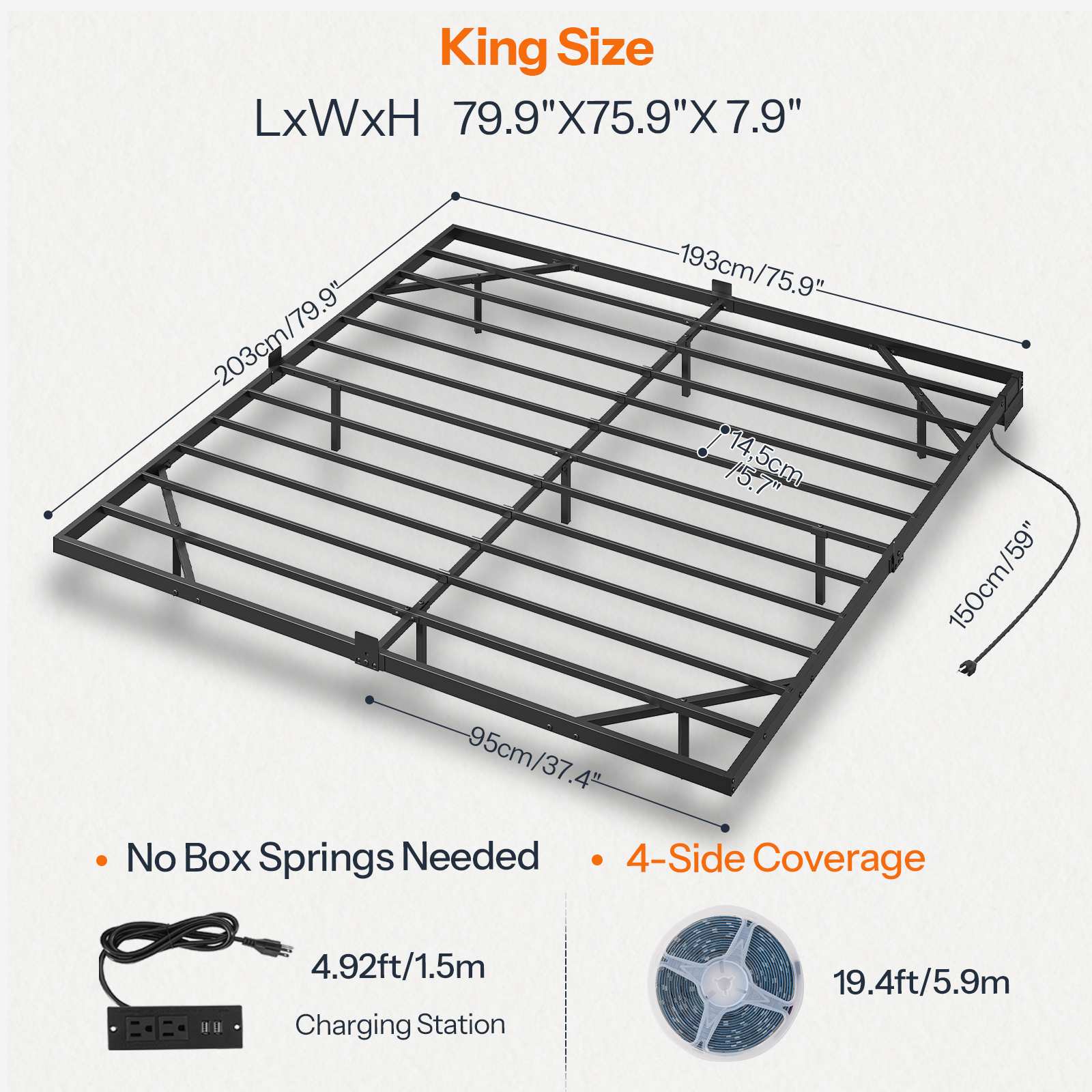 | Package Contents: | - 1 x Bed Frame - 1 x Accessory Kit - 1 x Charging Station - 1 x LED Light Strip and Remote Control - 1 x Instructions |