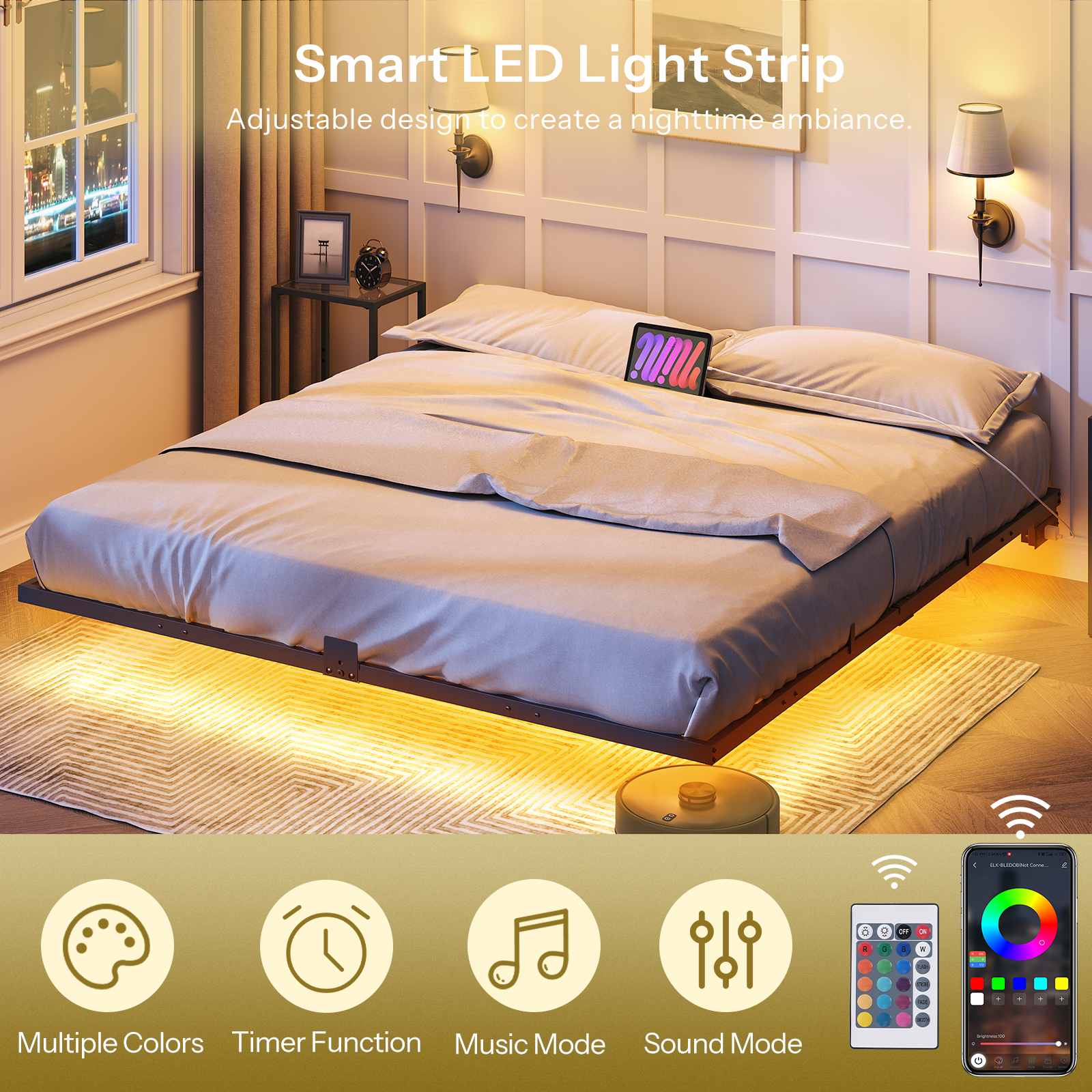 Multi-Functional LED Light Strip: Equipped with a multi-color LED light strip, the bed frame supports music and sound synchronization, along with a timer function. The light strip can be easily controlled via remote control or mobile app, and is securely fixed using snap-on adhesive, facilitating convenient ambiance adjustment for nighttime use.