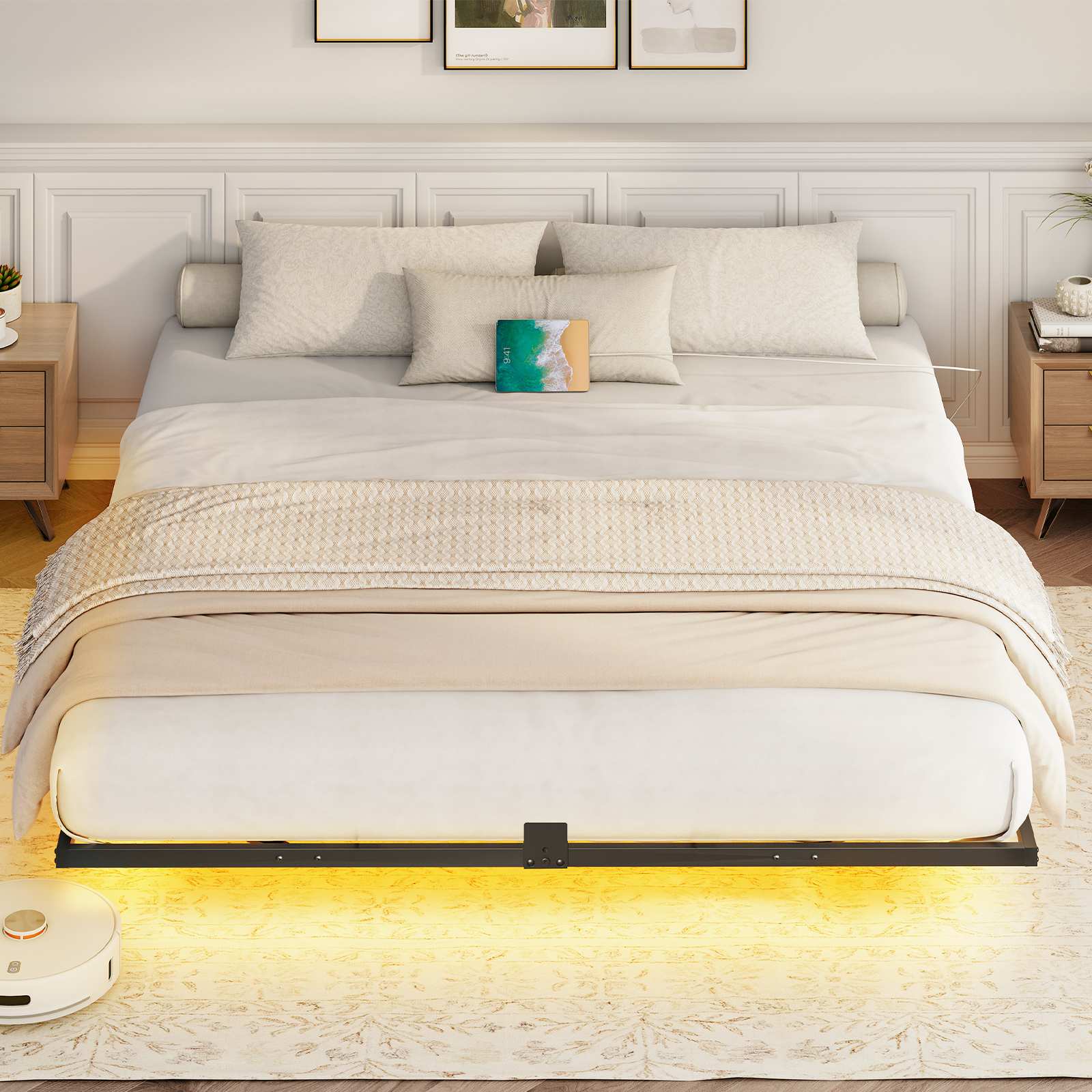 Floating Structure Design: The king-size bed frame is supported by nine internal legs on the main frame, ensuring structural stability while achieving a floating visual effect. The LED light strip installed under the bed enhances the modern aesthetic, emitting a soft and subtle glow, with an under-bed clearance of approximately 30cm for additional storage potential.
