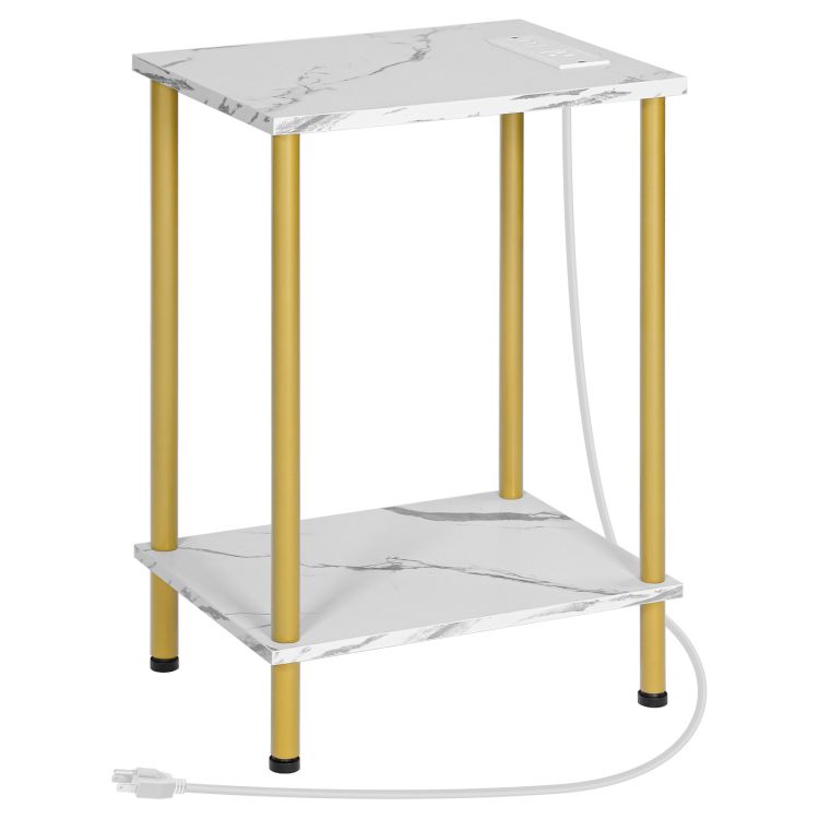 HOOBRO Side Table with Charging Station, End Table with USB Port and Outlet, Nightstand with 2-Layer Storage Shelves for Small Spaces, Living Room, Bedroom, Stable Frame, Gold and Marble