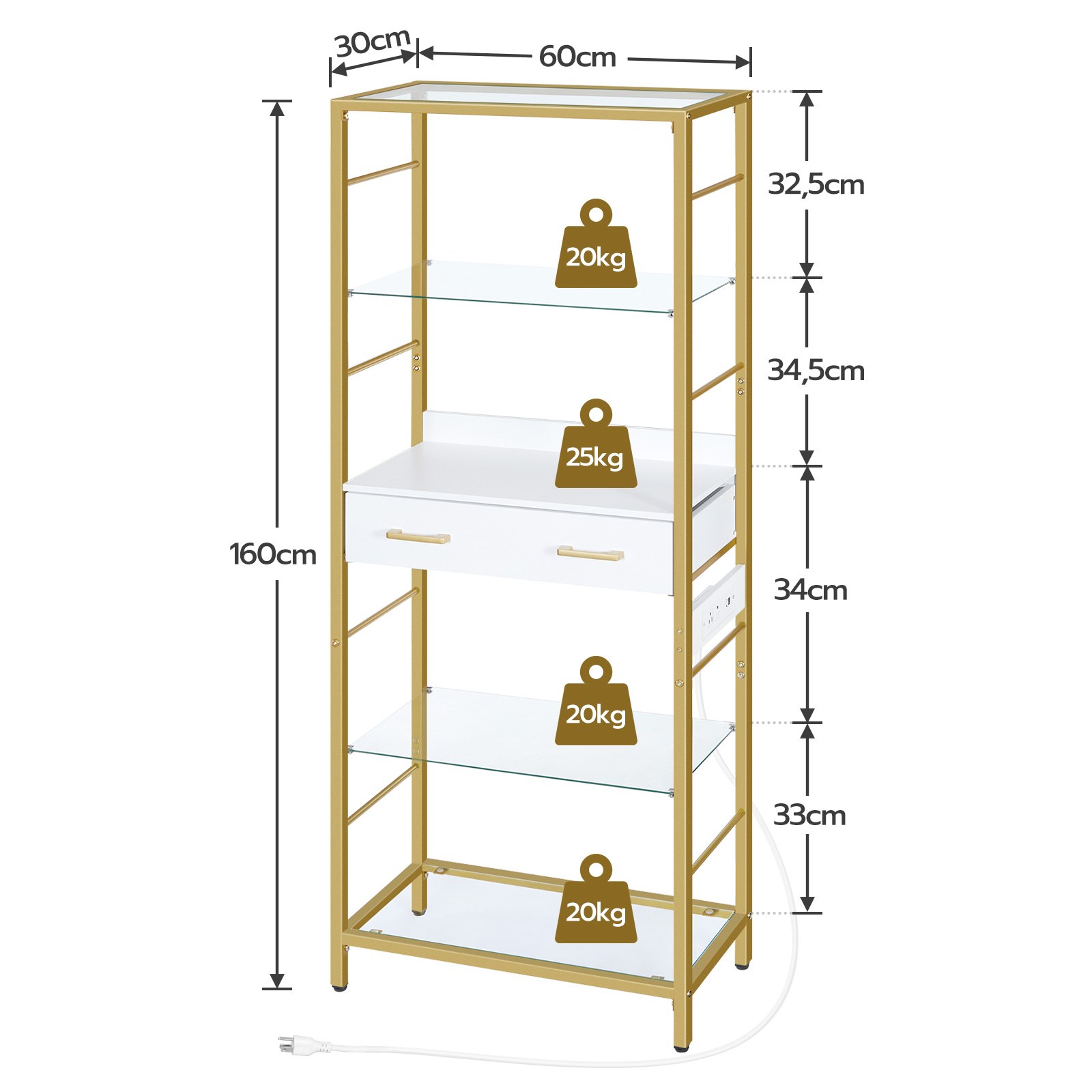 5-Tier Tempered Glass Bookcase with Drawer and Charging Station, Metal Frame Storage Shelves, Open Display Shelves for Living Room, White & Gold