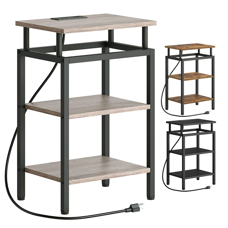 end table with charging station and usb ports, 3-tier nightstand with adjustable shelf, narrow side table for small space in living room, bedroom and balcony, rustic brown