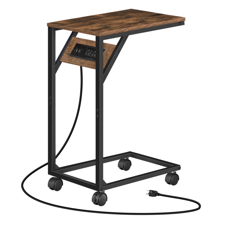 c shaped end table with charging station, sofa table with usb ports and outlets for small spaces, small side table for living room, bedroom, c couch table, rustic brown ethr06e01