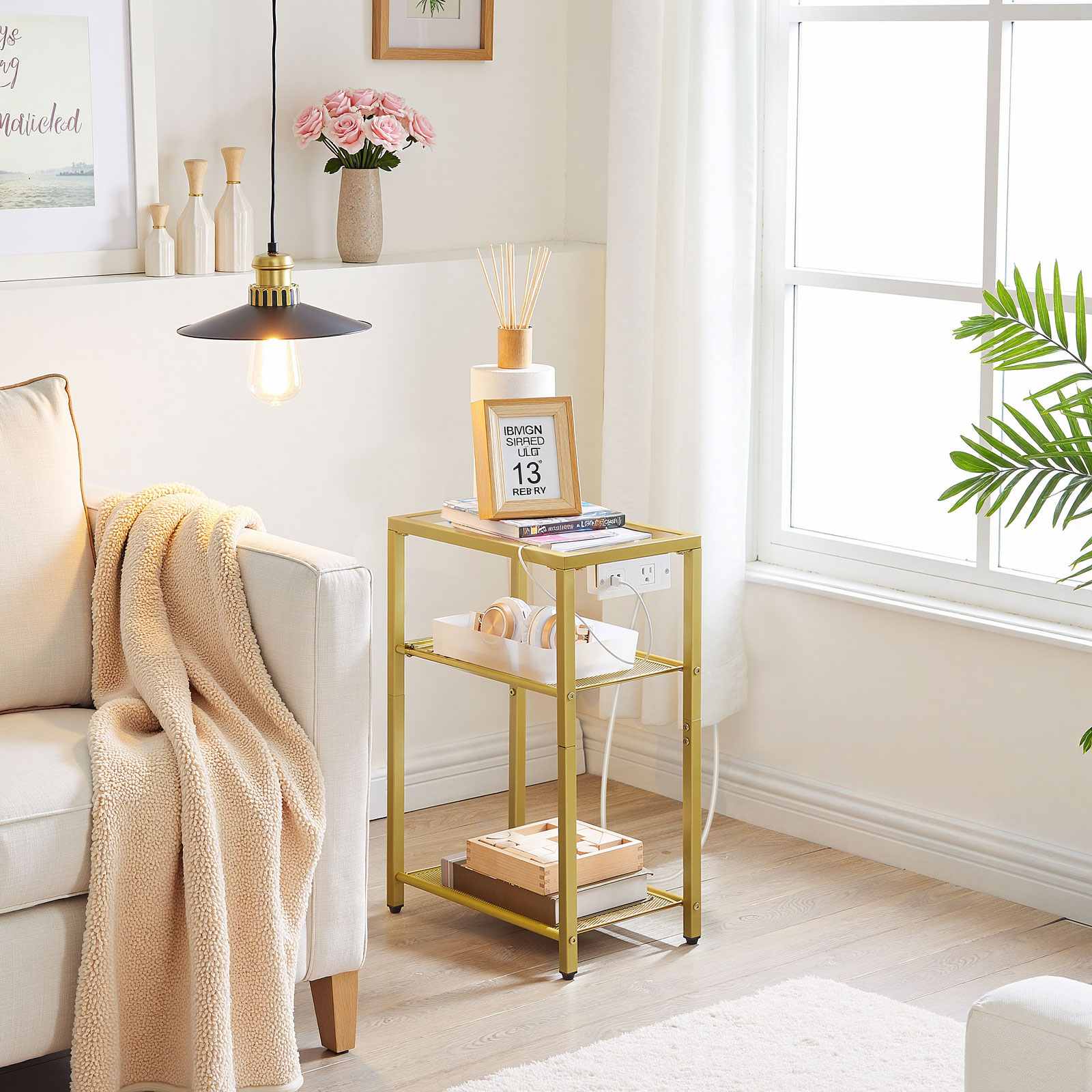3-Tier End Table with Integrated Charging Station, Tempered Glass Side Table Equipped with USB Ports & Outlet, Modern Gold Metal Frame Nightstand with Storage Shelves for Living Room & Bedroom