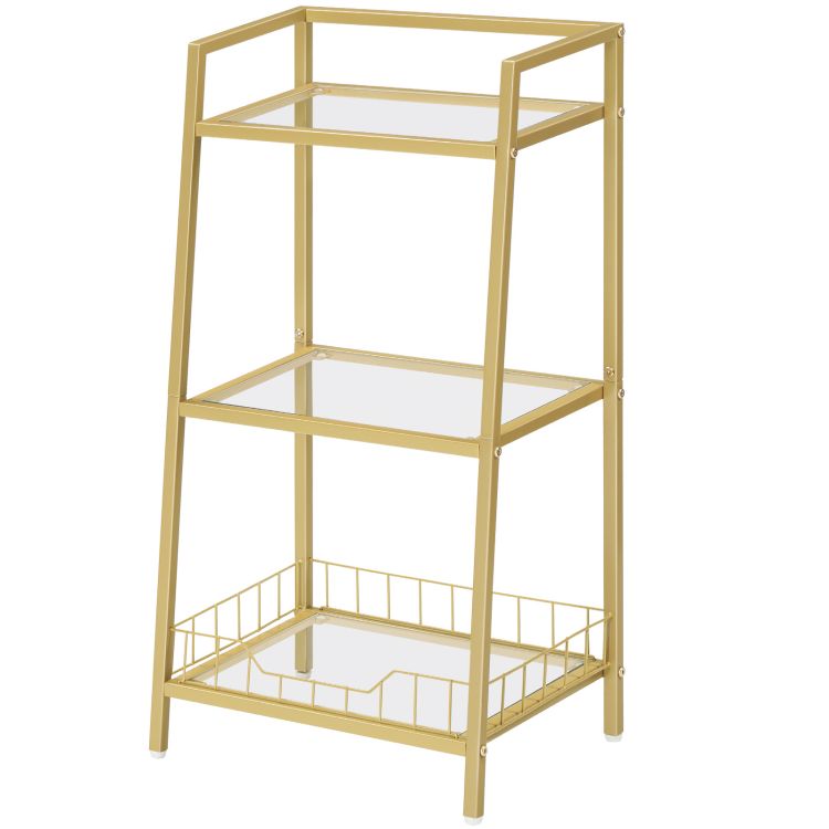 gold bookshelf, 3-tier tempered glass bookcase, bathroom storage stand, record storage rack with side guards, strong and durable, for bathroom, bedroom, living room modern style, gold gd77cj01