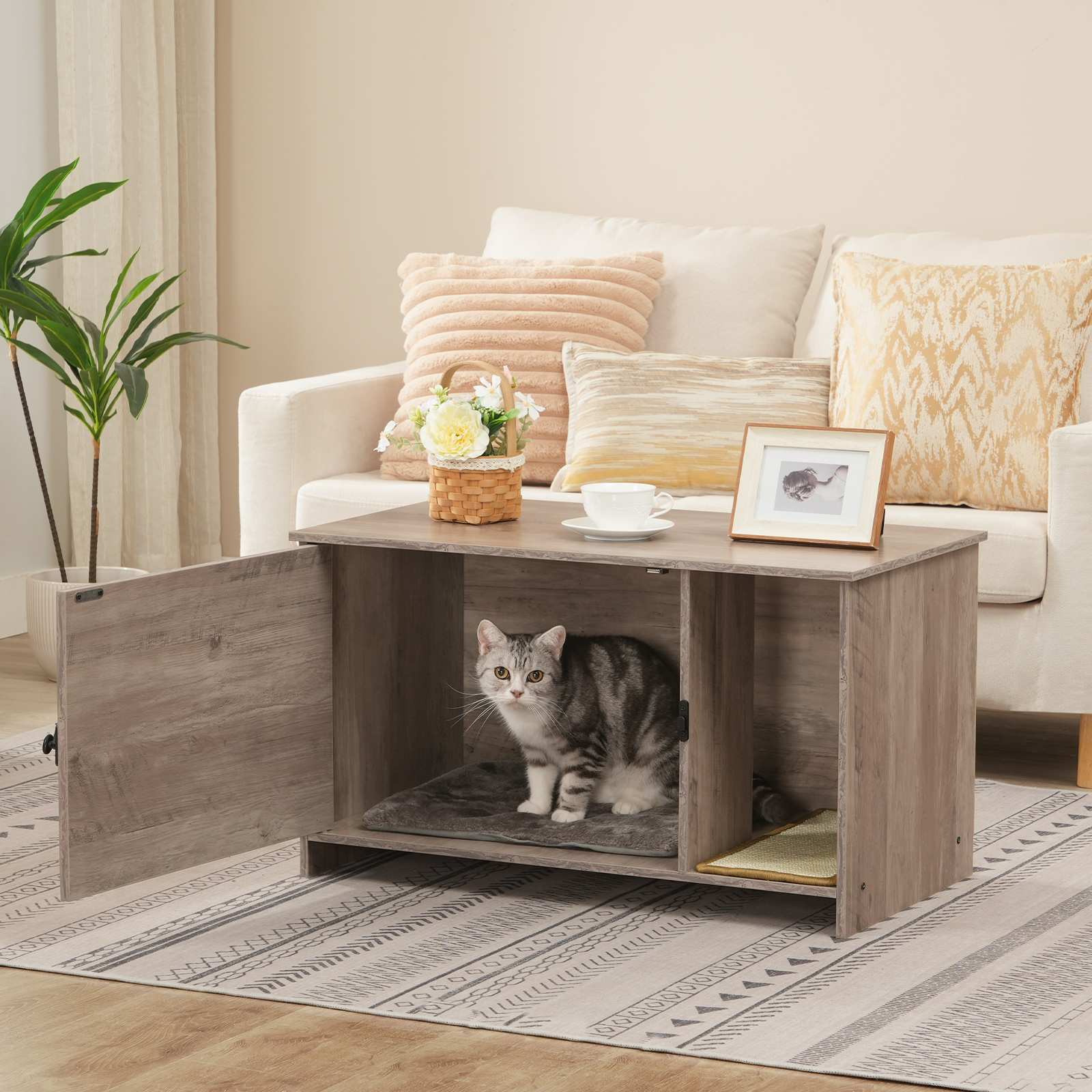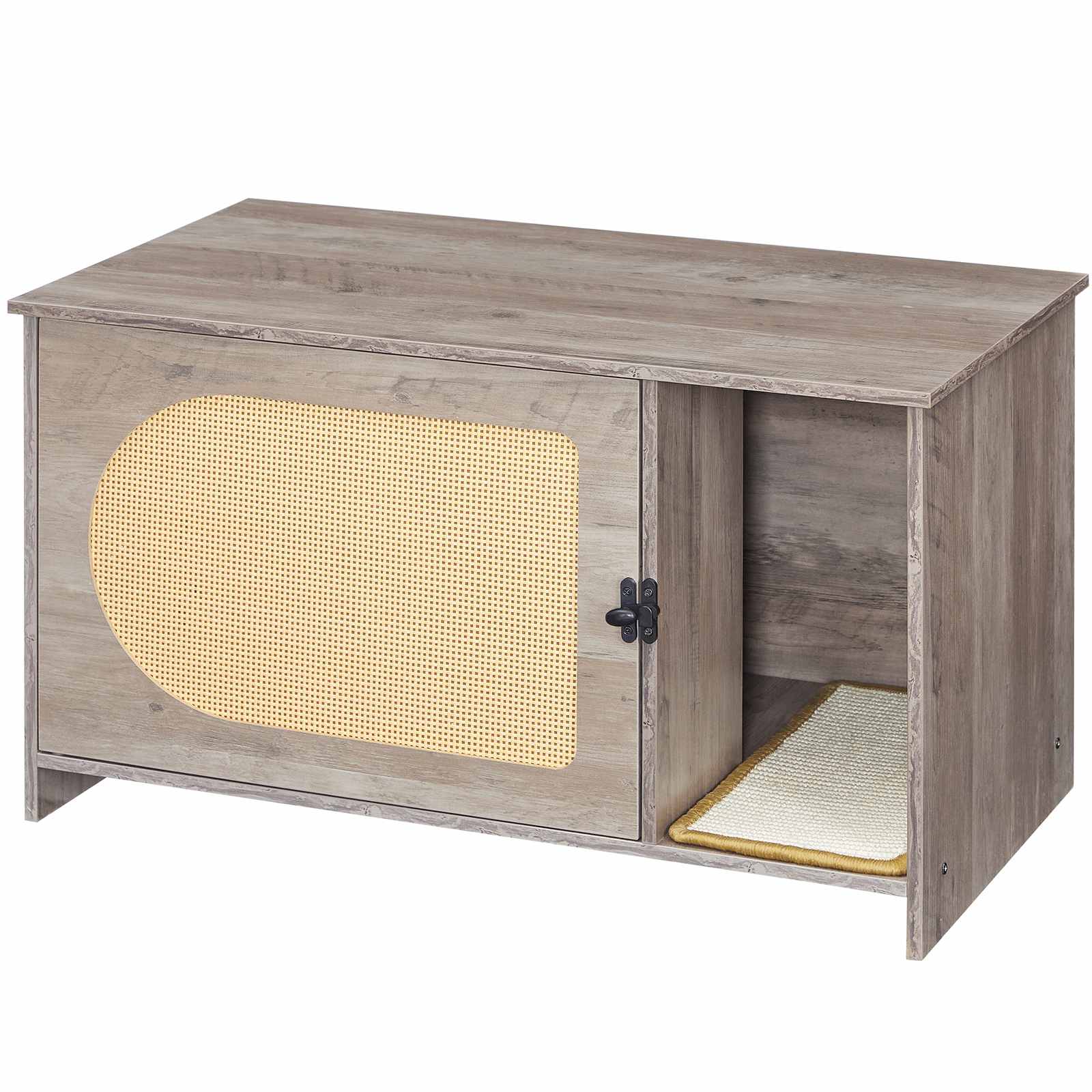 Elegant Aesthetic Design: This cat litter box enclosure features a door adorned with faux rattan decorations, infusing a natural texture into residential spaces. The greige finish boasts a fine surface texture and strong compatibility with various indoor decoration styles, effectively enhancing the overall aesthetic layout of the living environment.