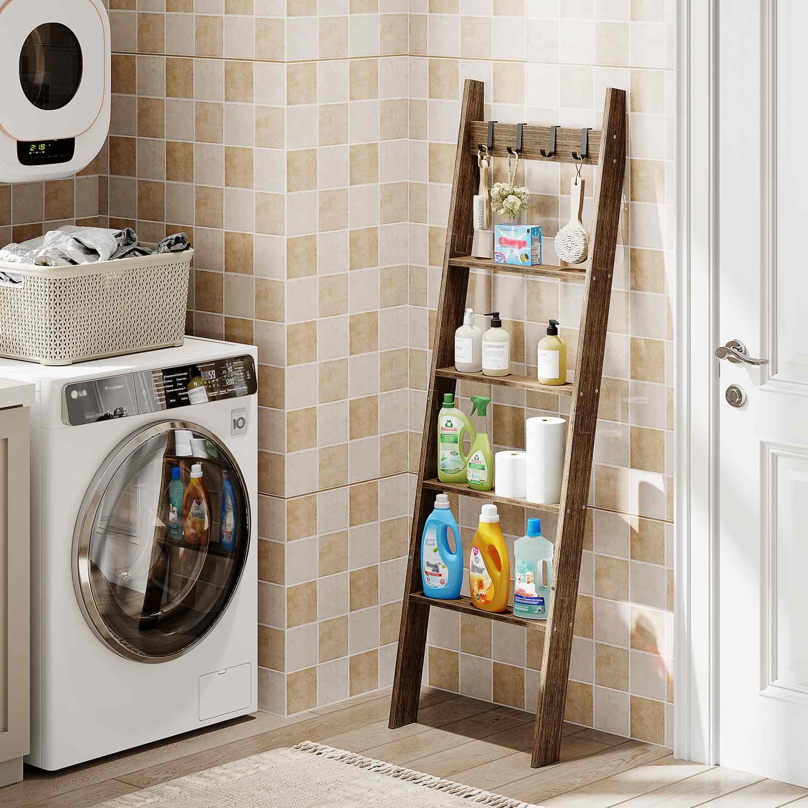 5-Tier Blanket Ladder, Wall-Leaning Towel Rack with 4 Removable Hooks, Bamboo Decorative Shelf for Living Room, Bedroom & Bathroom, Farmhouse Storage, Mocha